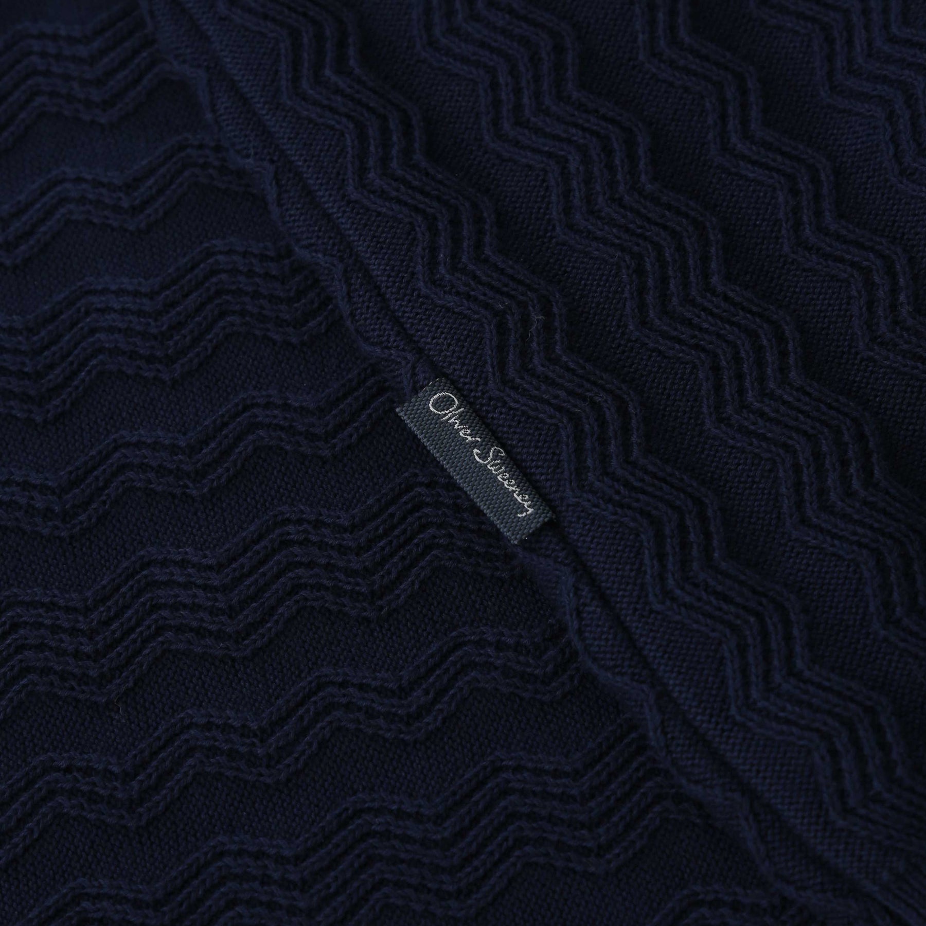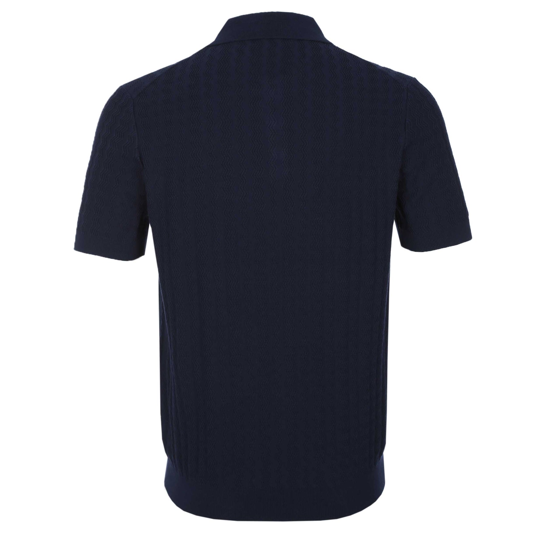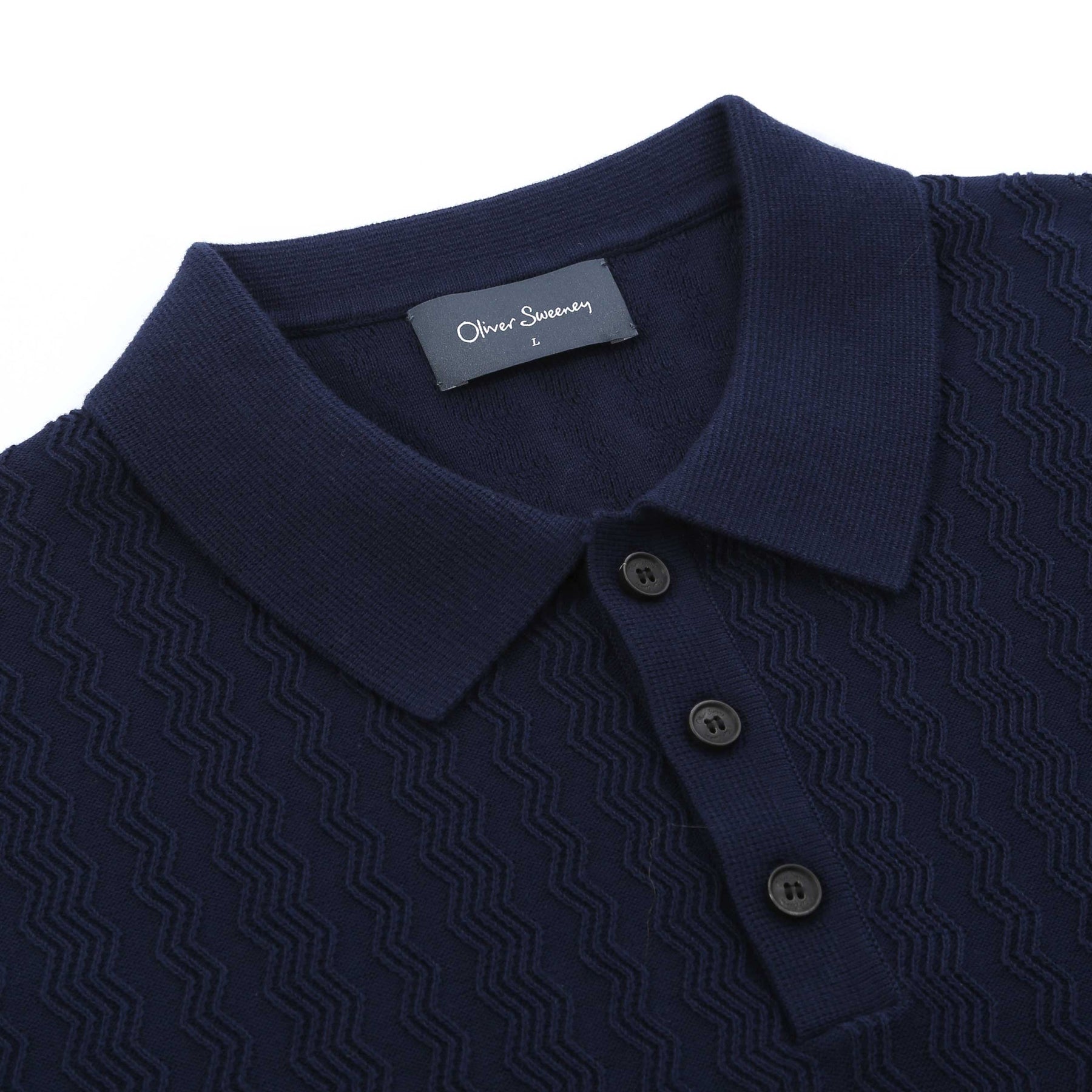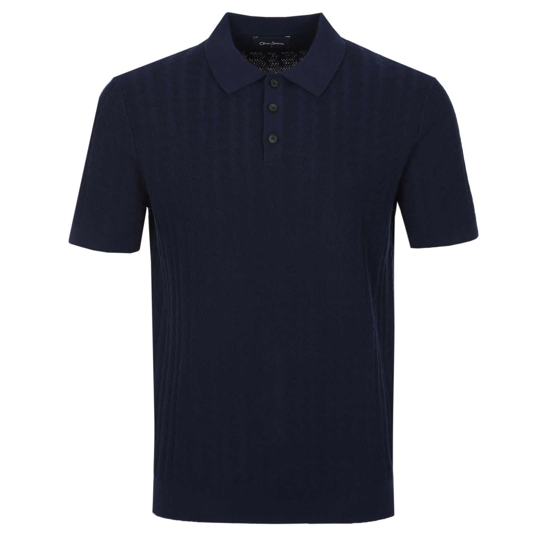 Oliver Sweeney Hammond Knit Polo Shirt in Navy. This Knitted polo shirt is crafted from fine 100% cotton navy yarn, offering a soft yet refined feel. A distinctive vertical zigzag relief pattern adds subtle texture and depth to the design. The cuffs and hem are finished with a reinforced double rib for enhanced structure and durability, while the collar and placket are constructed in a Milano stitch. The look is completed with three natural horn buttons for an elevated, timeless touch.