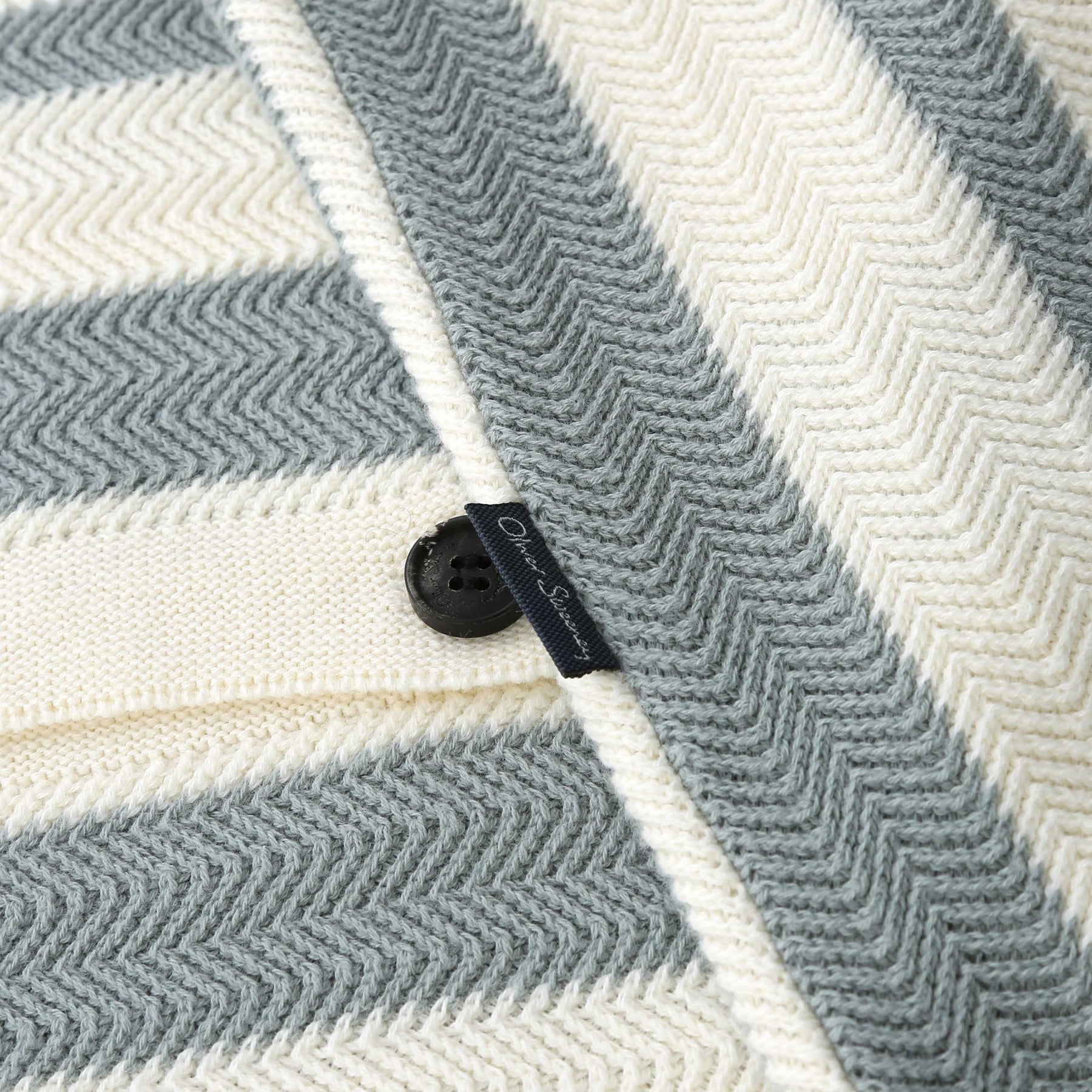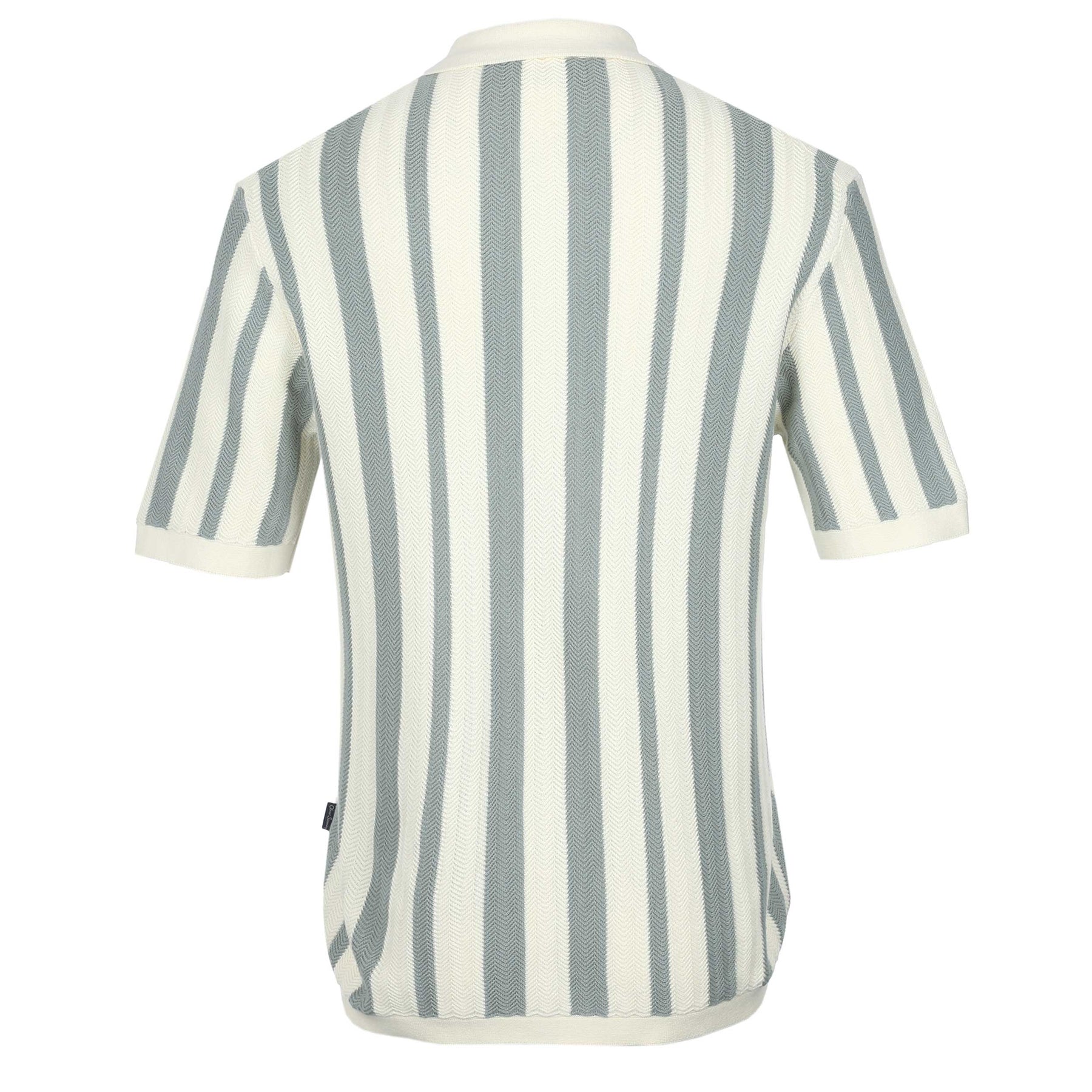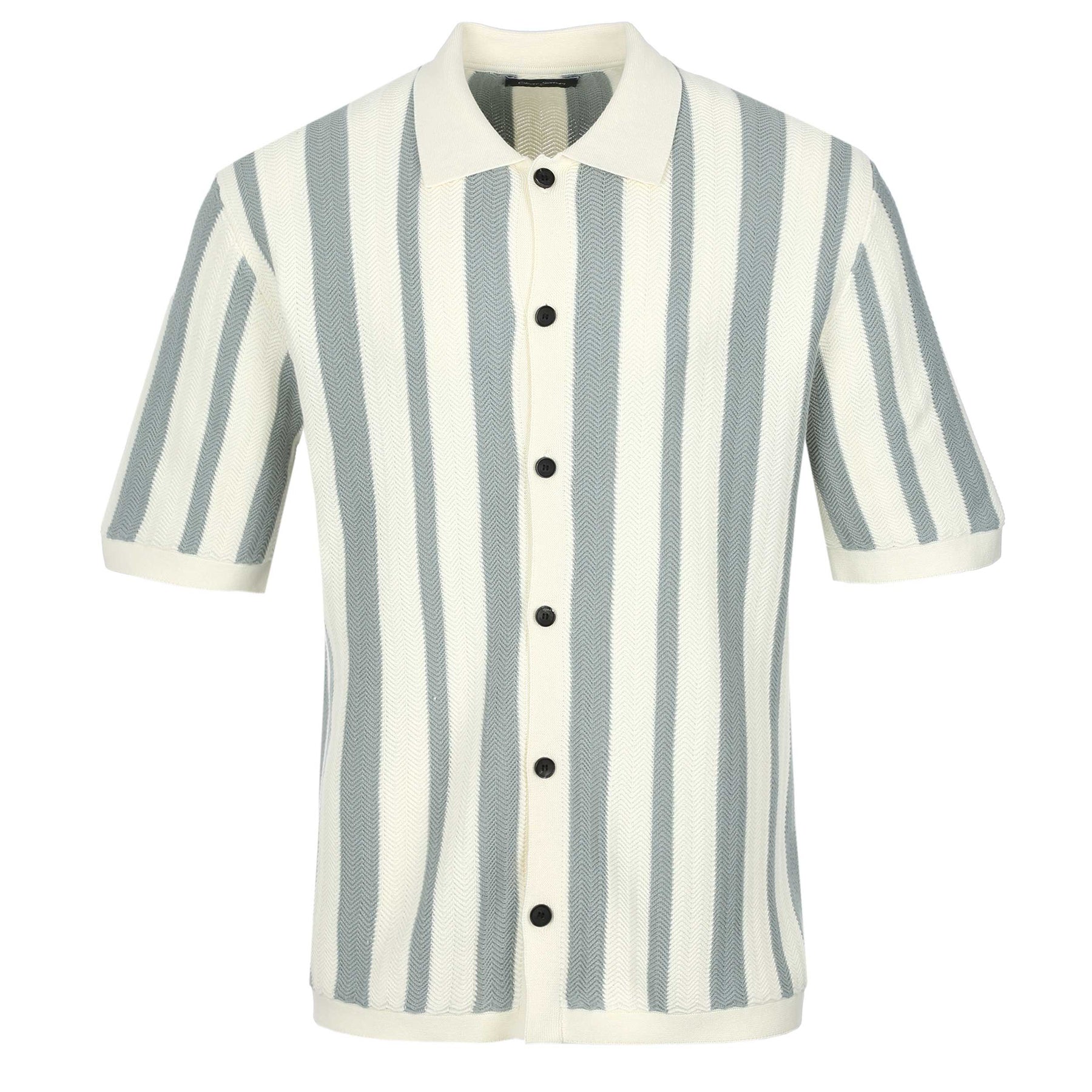 Oliver Sweeney Liffey Knitted SS Shirt in Mid Green & Ecru. Crafted from 100% premium cotton yarn, this men’s knitted shirt delivers breathable comfort with a refined, textured finish. Designed in a relaxed fit, the rack stitch construction creates a distinctive vertical herringbone knit, showcased in a soft blue and ecru stripe for effortless warm-weather style. The collar, placket, cuffs and hem are reinforced with a pearl stitch — a flat, stable knit structure that enhances durability and helps the shirt retain its shape wear after wear. Finished with natural horn buttons for an elevated touch, this cotton knit shirt bridges the gap between smart and casual with ease.