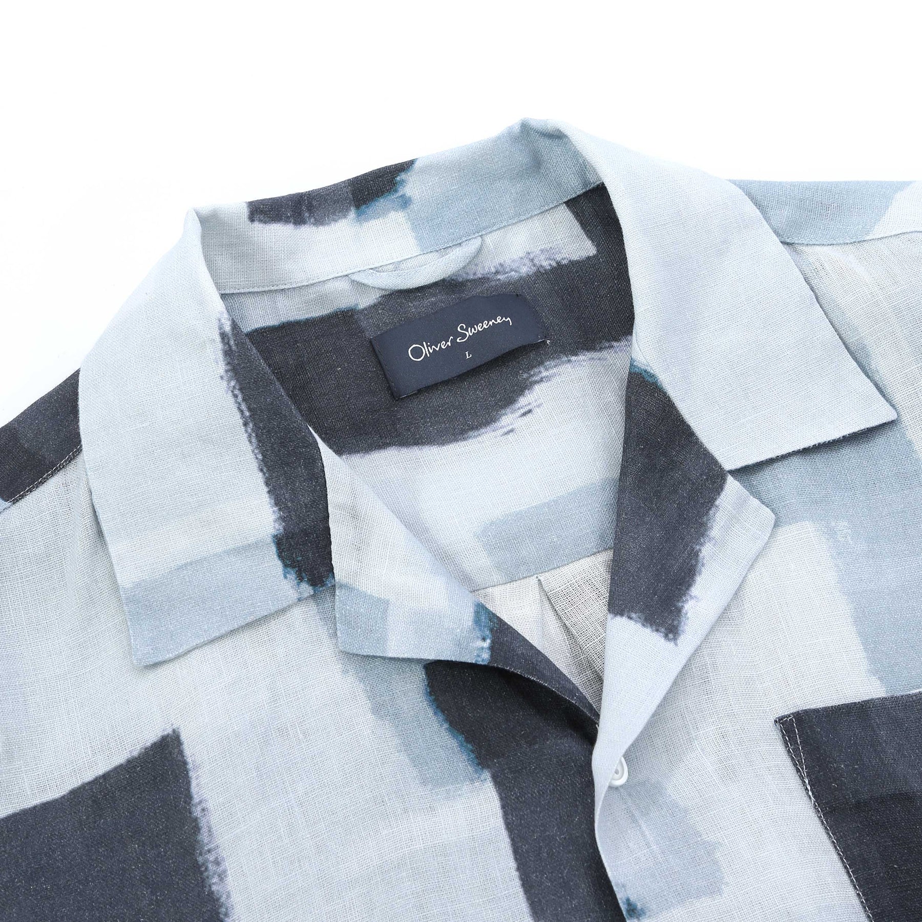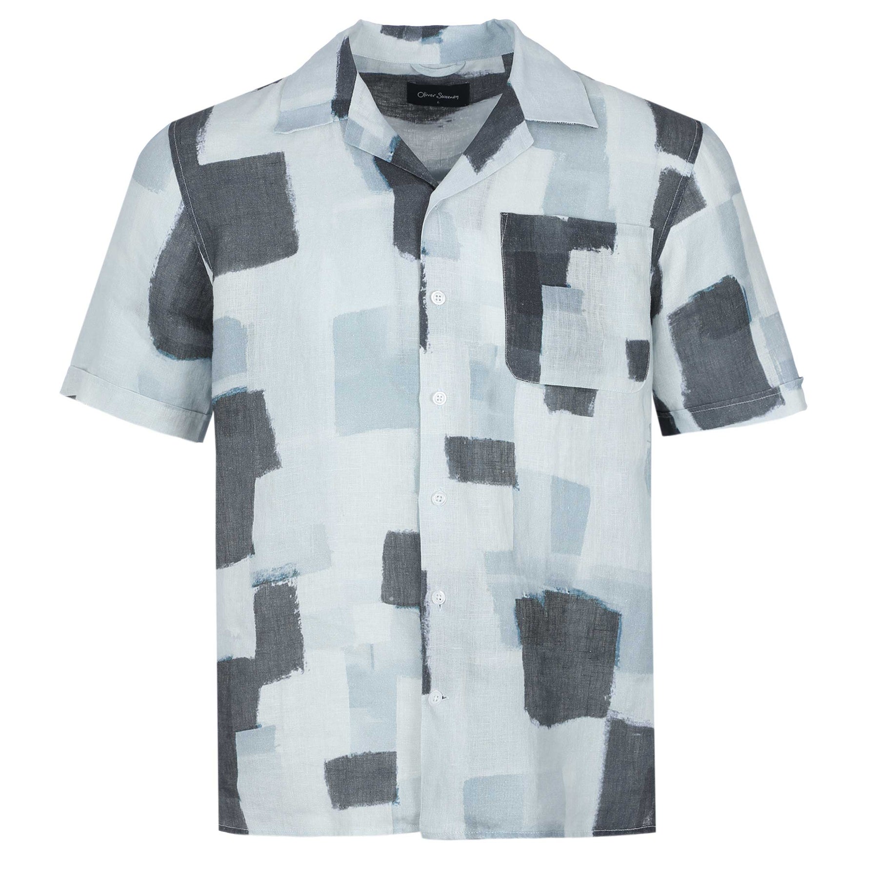 The Oliver Sweeney Meada Linen SS Shirt in Slate features a beautifully abstract print in subtle shades of grey and pale blue, set against a clean white background. This refined design not only exudes elegance but ensures versatility, allowing it to be paired seamlessly with various outfits.