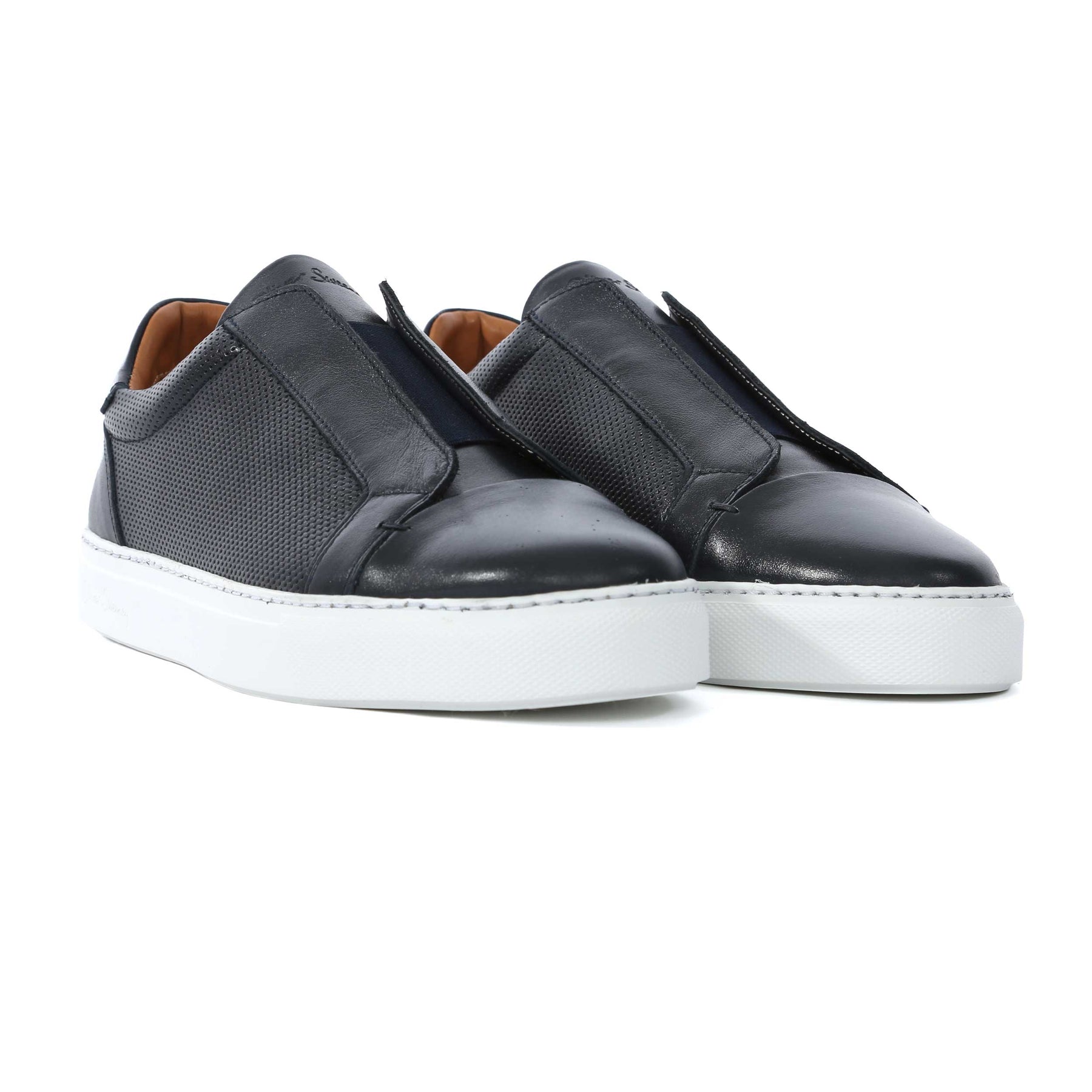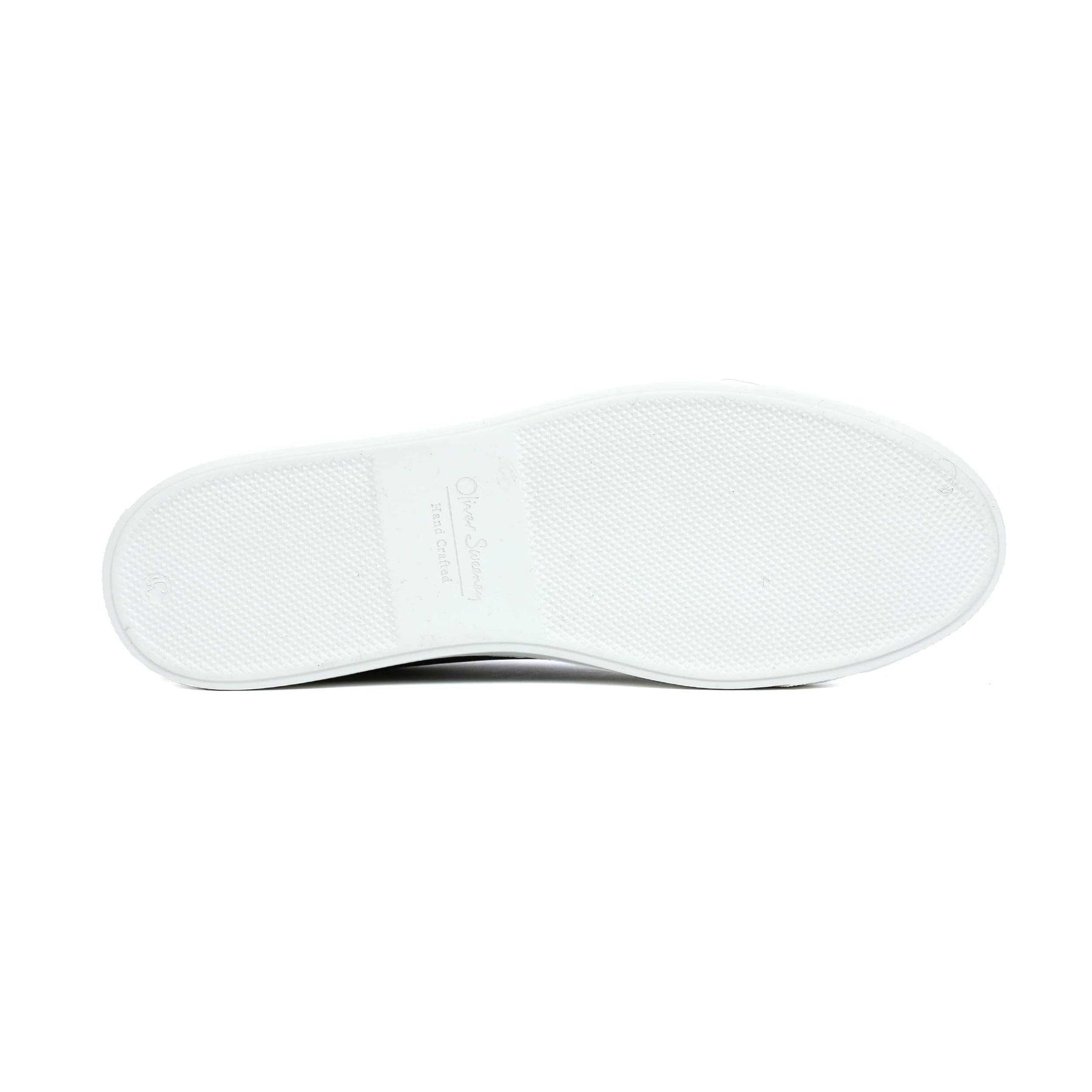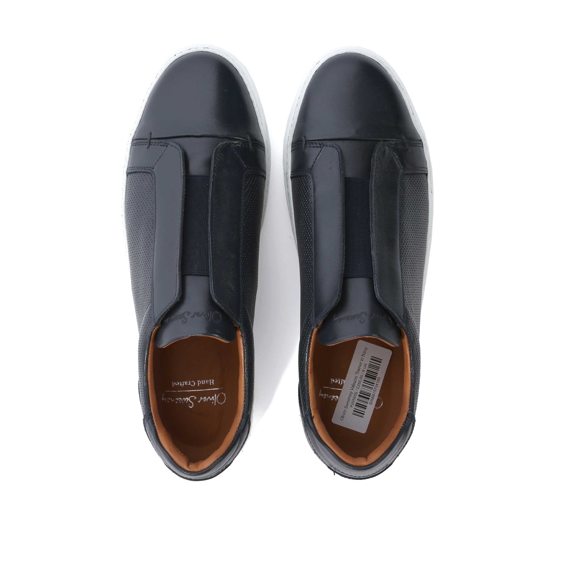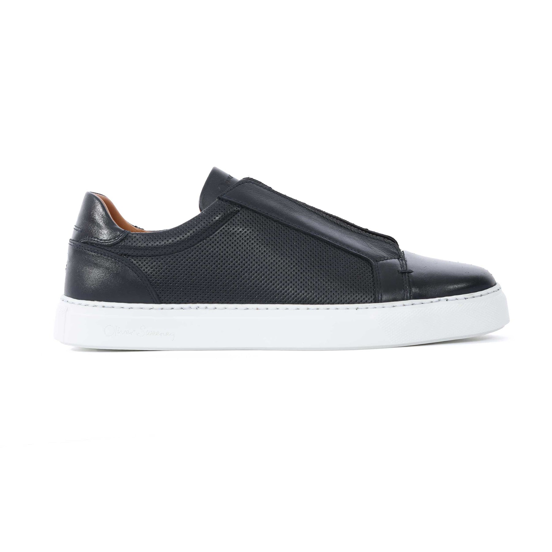 Oliver Sweeney Valezim Trainer in Navy. A handmade trainer by Oliver Sweeney. This slip on leather trainer has a plain design with an elasticated strap for a secure and perfect fit. Perforated side panel detailing with a contrasting white sole. Padded collar. Embroidered tonal stitch logo to the heel panels. Signature Oliver Sweeney logo to the sole unit. A smart trainer to compliment jeans or shorts.