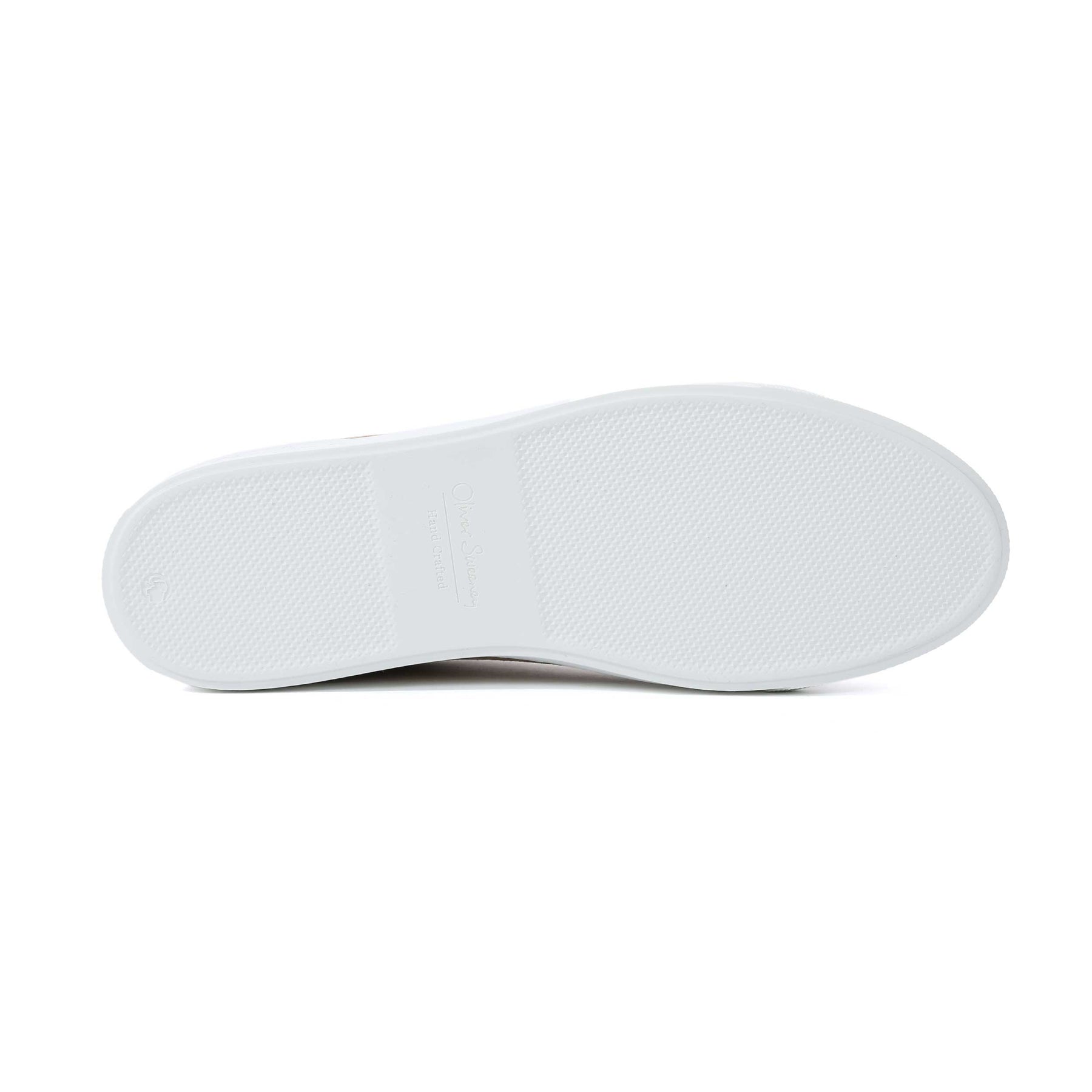 Oliver Sweeney Valezim Trainer in Sand Suede. A handmade trainer by Oliver Sweeney. This slip on suede trainer has a plain design with an elasticated strap for a secure and perfect fit. Perforated side panel detailing with a contrasting white sole. Padded collar. Embroidered tonal stitch logo to the heel panels. Signature Oliver Sweeney logo to the sole unit. A smart trainer to compliment jeans or shorts.