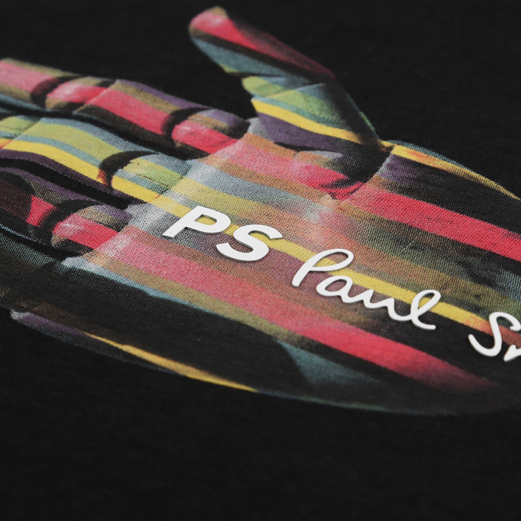 Paul Smith Hand T Shirt in Black. A short sleeve crew neck t-shirt by Paul Smith featuring an artistic striped hand print design. Constructed from a soft cotton. Raised rubber Paul Smith branding on the body of the t-shirt. Perfect for everyday wear.