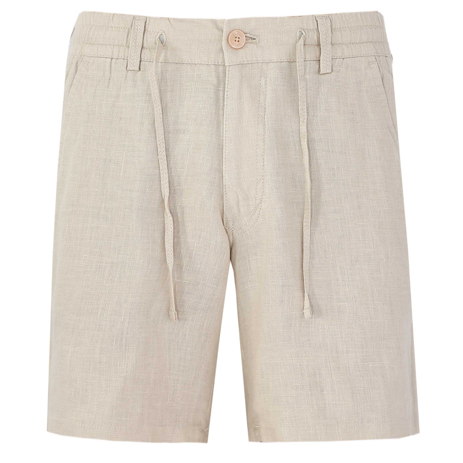 Remus Uomo Elio Linen Short in Beige. This is a straight fit, chino style short crafted from 100% linen. Fly and zip fastening placket. Elasticated waistband with drawstring fastening. Detailed with two slit pockets on the front of the shorts and finishing with two buttoned seat pockets. Tonal Remus Uomo logo to the seat pocket.