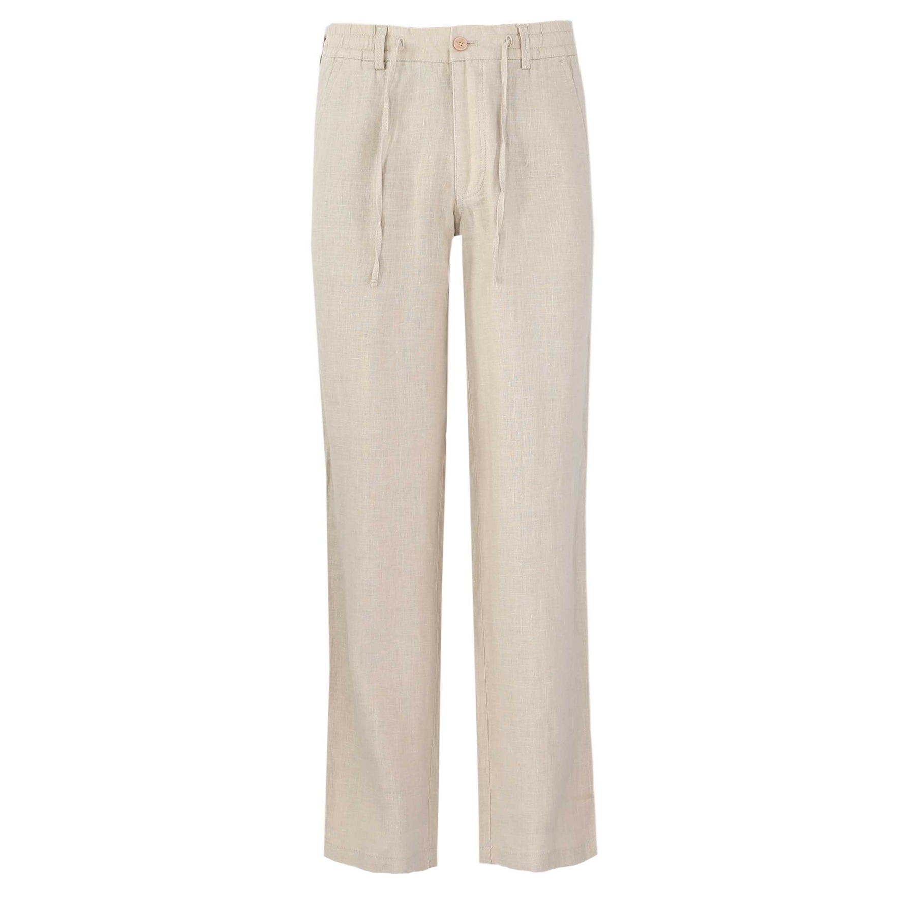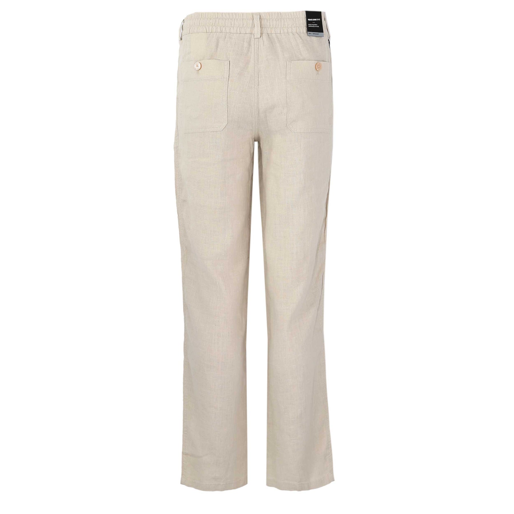 Remus Uomo Elio Linen Trouser in Beige. This is a straight fit linen trouser crafted from 100% linen. Button and fly fastening. Elasticated waistband with drawstring fastening. Detailed with two slit pockets on the front of the shorts and finishing with two buttoned seat pockets. Tonal Remus Uomo logo to the seat pocket.