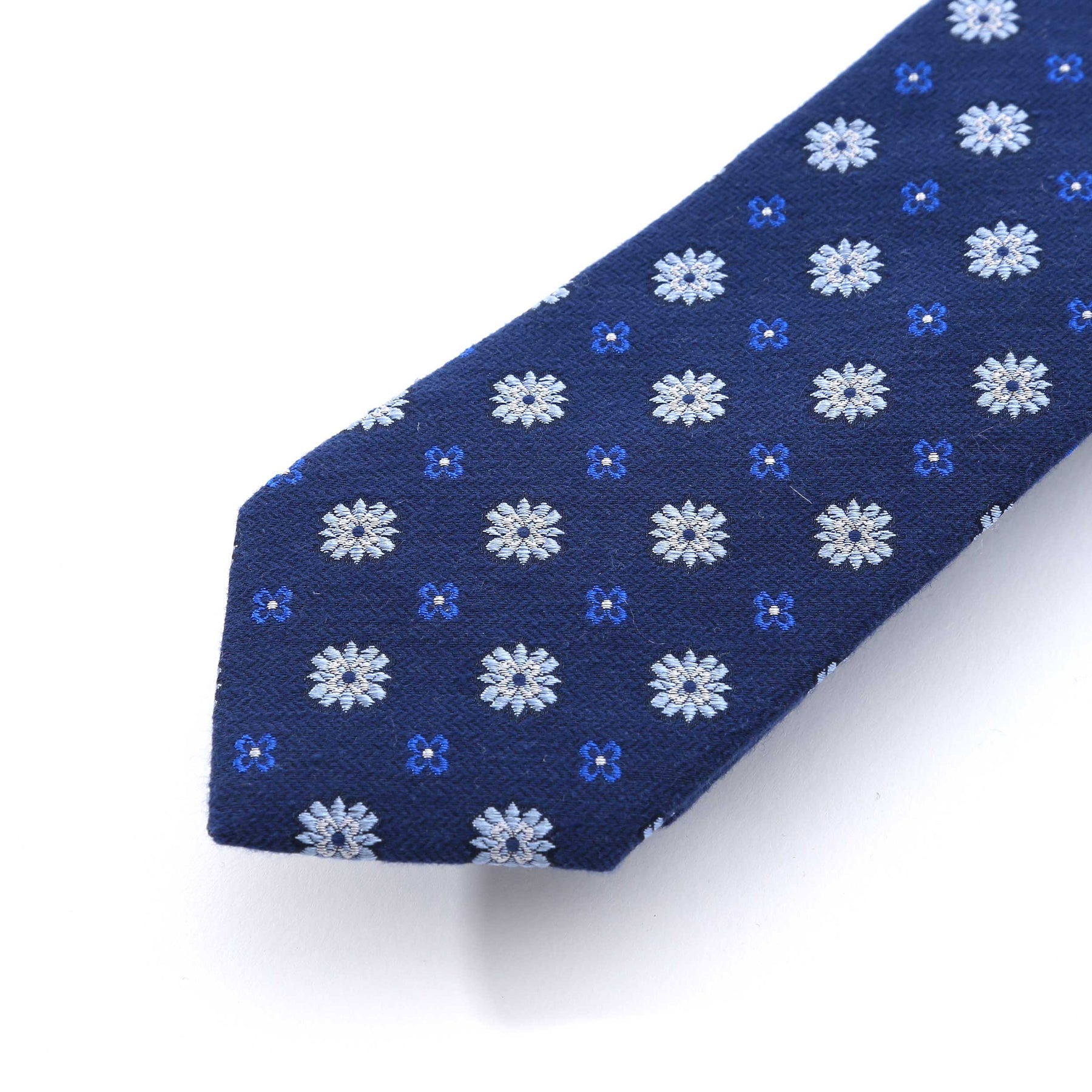 Remus Uomo Geometric Floral Tie & Hank Set in Navy. Tie & Hank set by Van Buck. A classic style design tie. Square Handkerchief. Both the tie and handkerchief arrive with a geometric floral design. Crafted from a silk cotton mix. Team up with your tailoring for a sophisticated look.