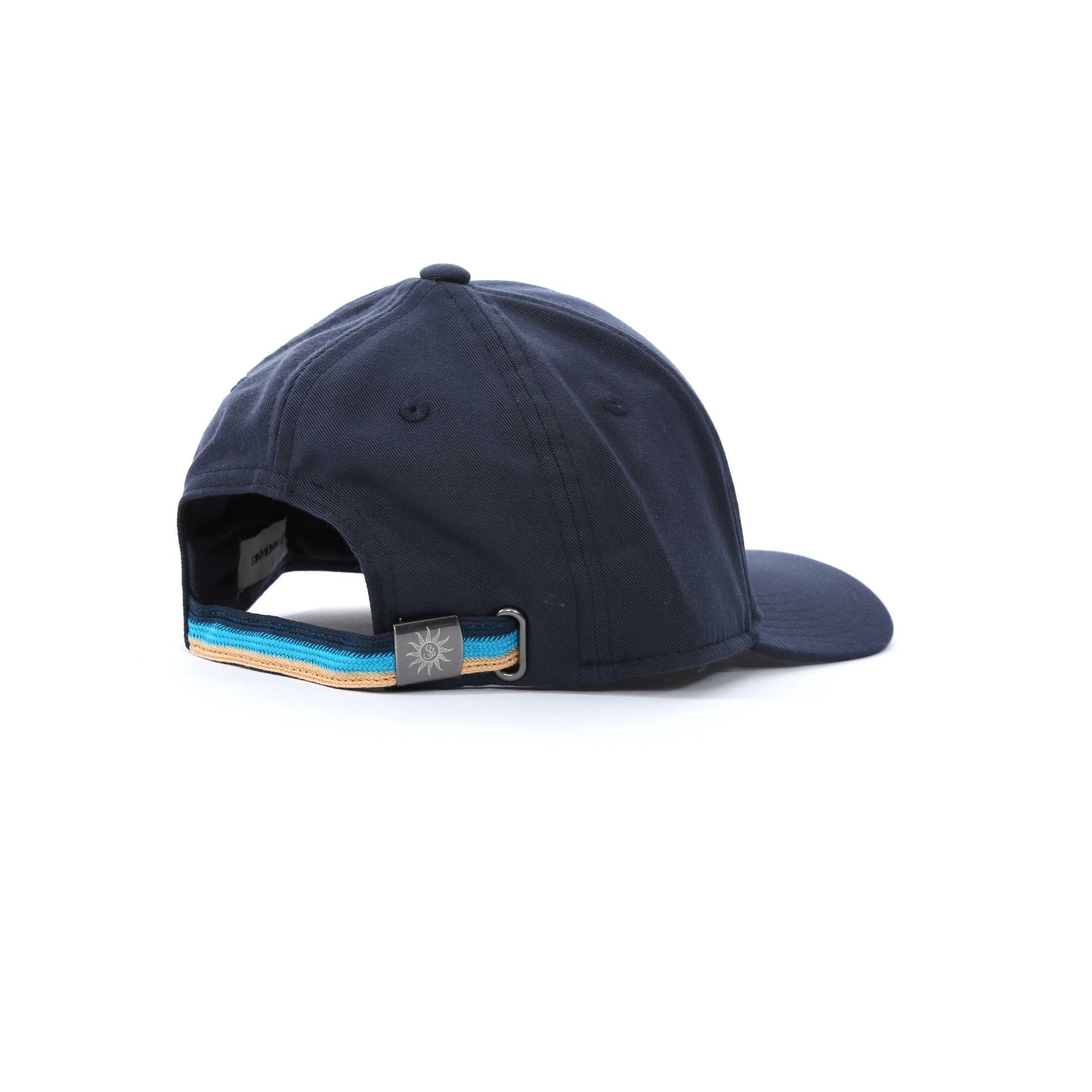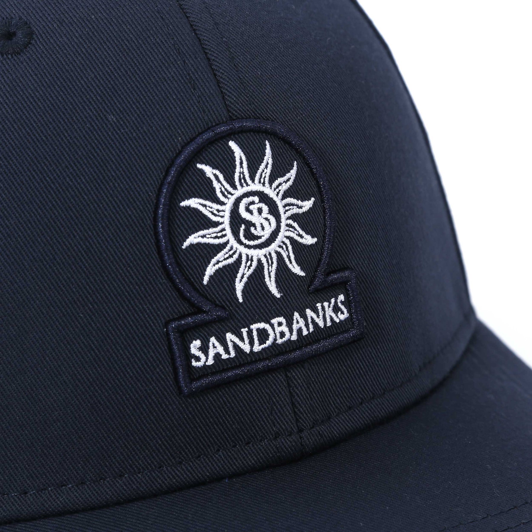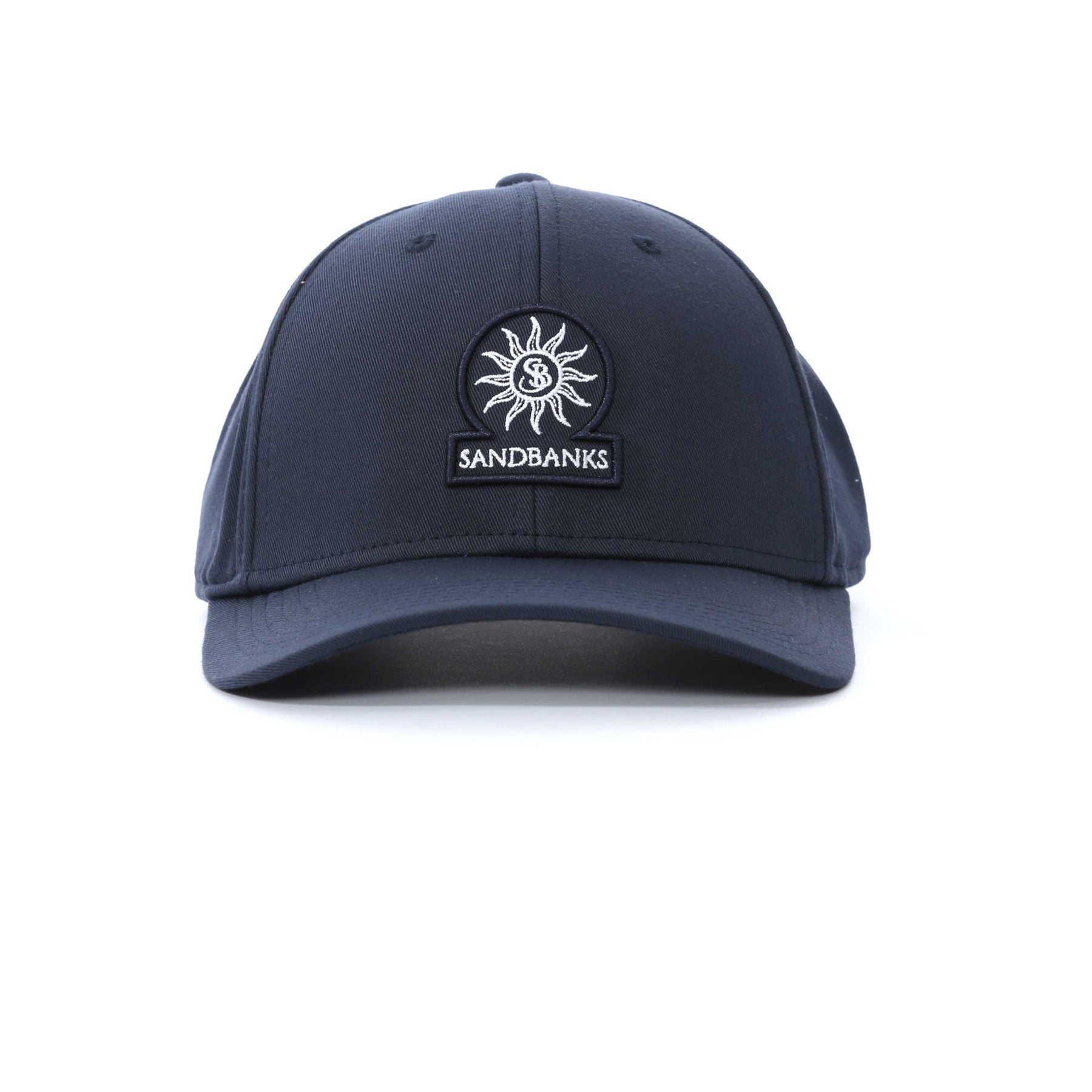 Sandbanks Badge Logo Cap in Navy. Cap by Sandbanks. A plain design cap with a knitted tri-colour adjustable strap to the rear. Embroidered Sandbanks logo to the front. Engraved SB logo to the metal clasp. Embroidered eyelets to the cap.