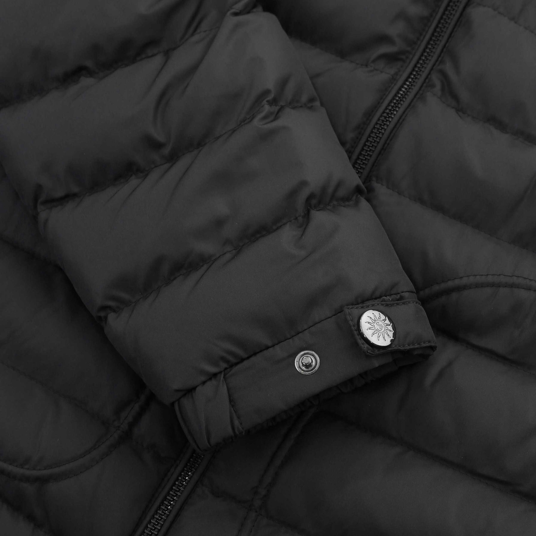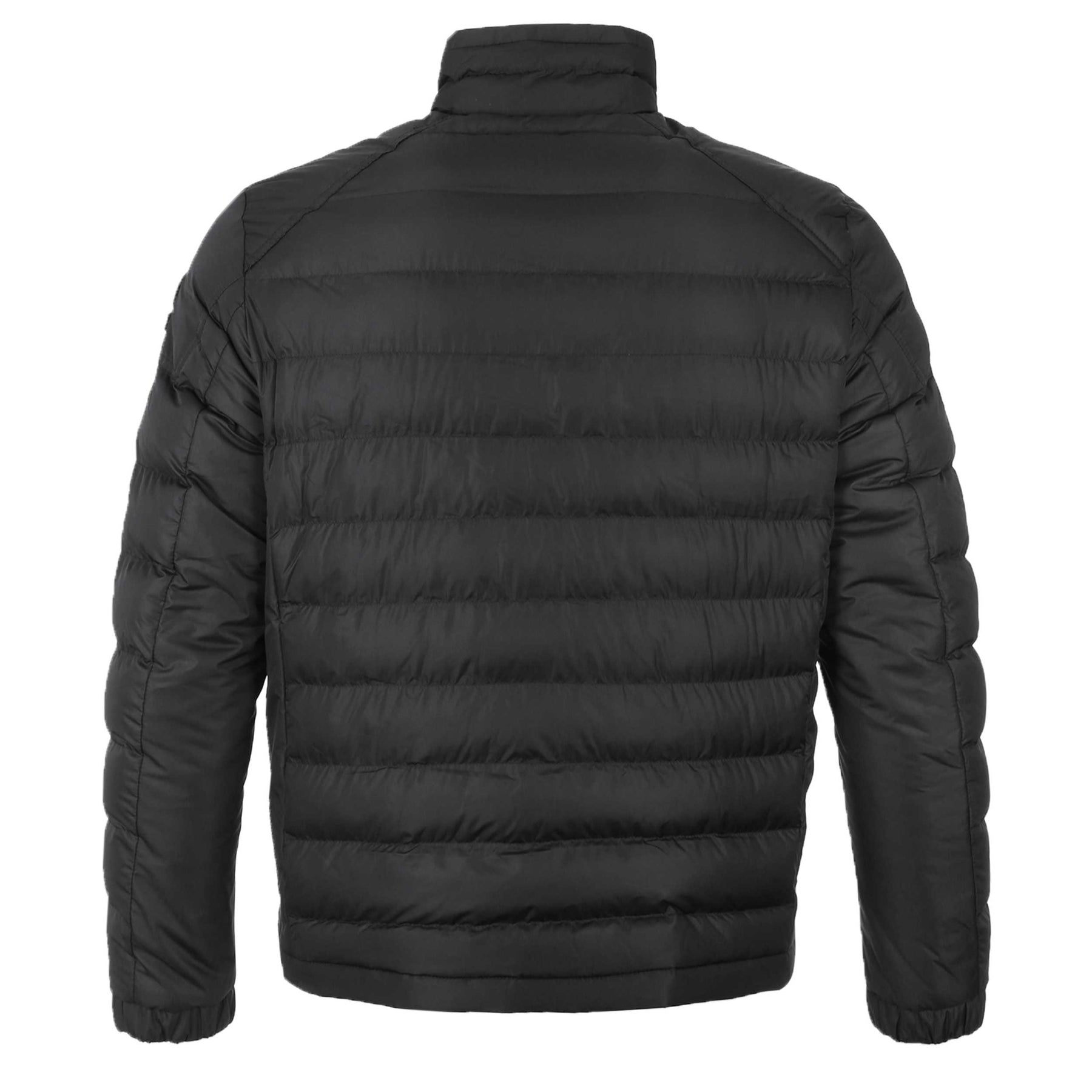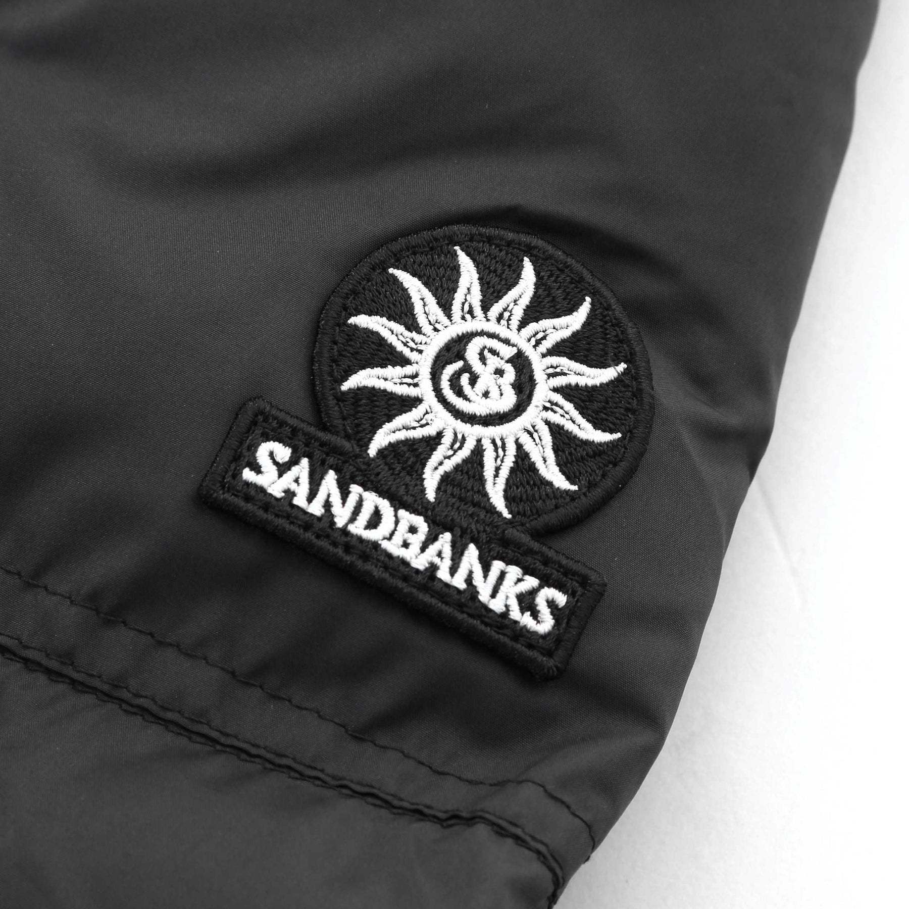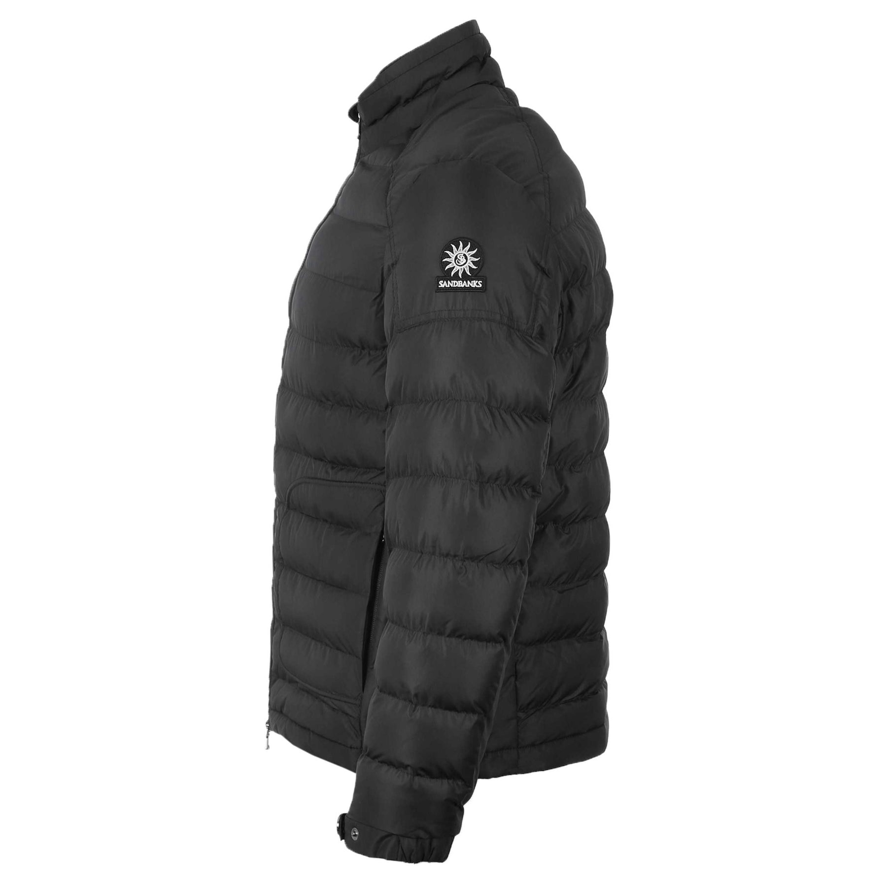 Sandbanks Biker Micro Puffer Jacket in Black. A slim fit puffer jacket by Sandbanks. Two way fastening zip placket to the front. Funnel neck jacket with racer inspired detailing's throughout the jacket. Shoulder panel detailing. Zip fastening front pocket with external stitch detail. Elasticated, adjustable press stud cuffs. Embroidered Sandbanks logo badge to the sleeve.