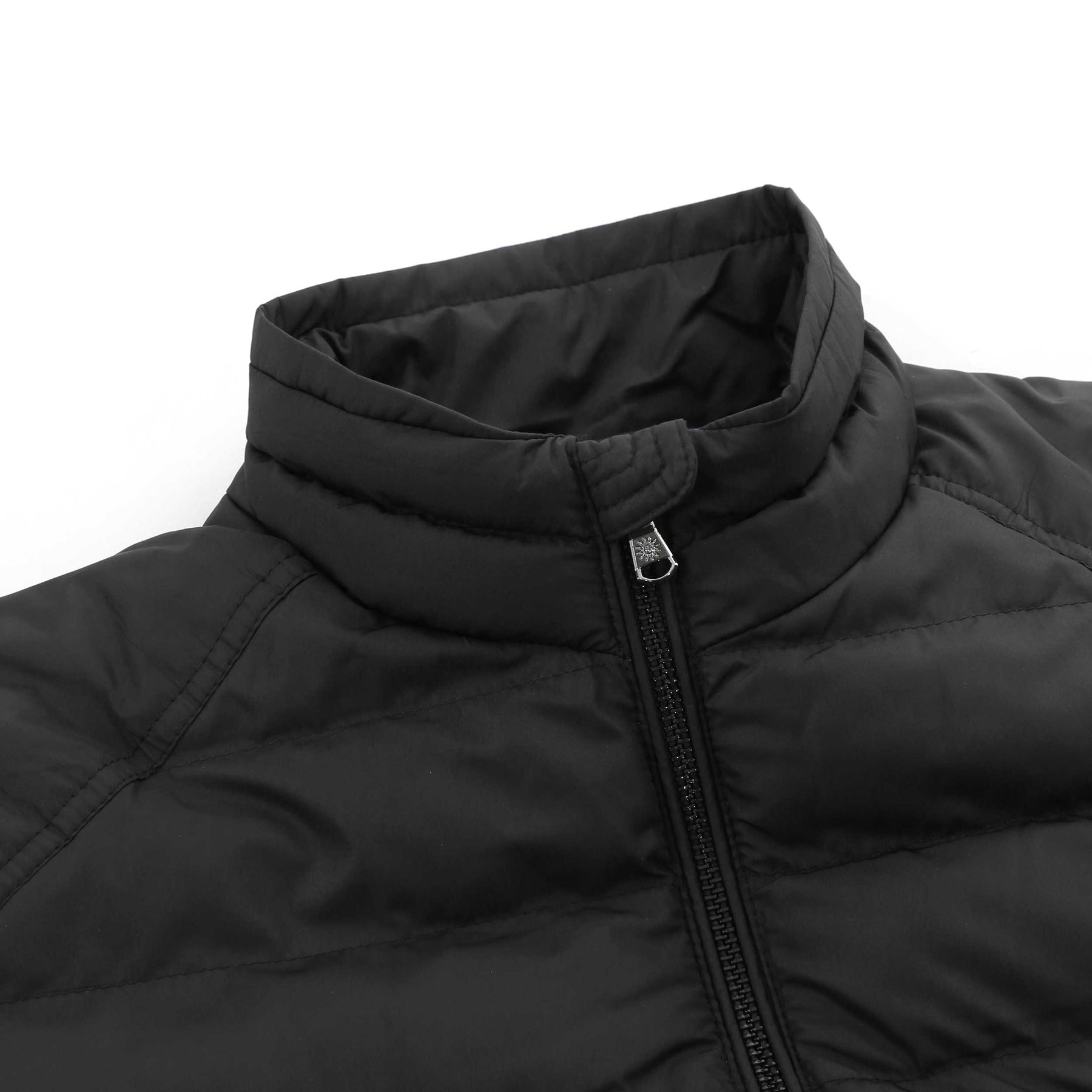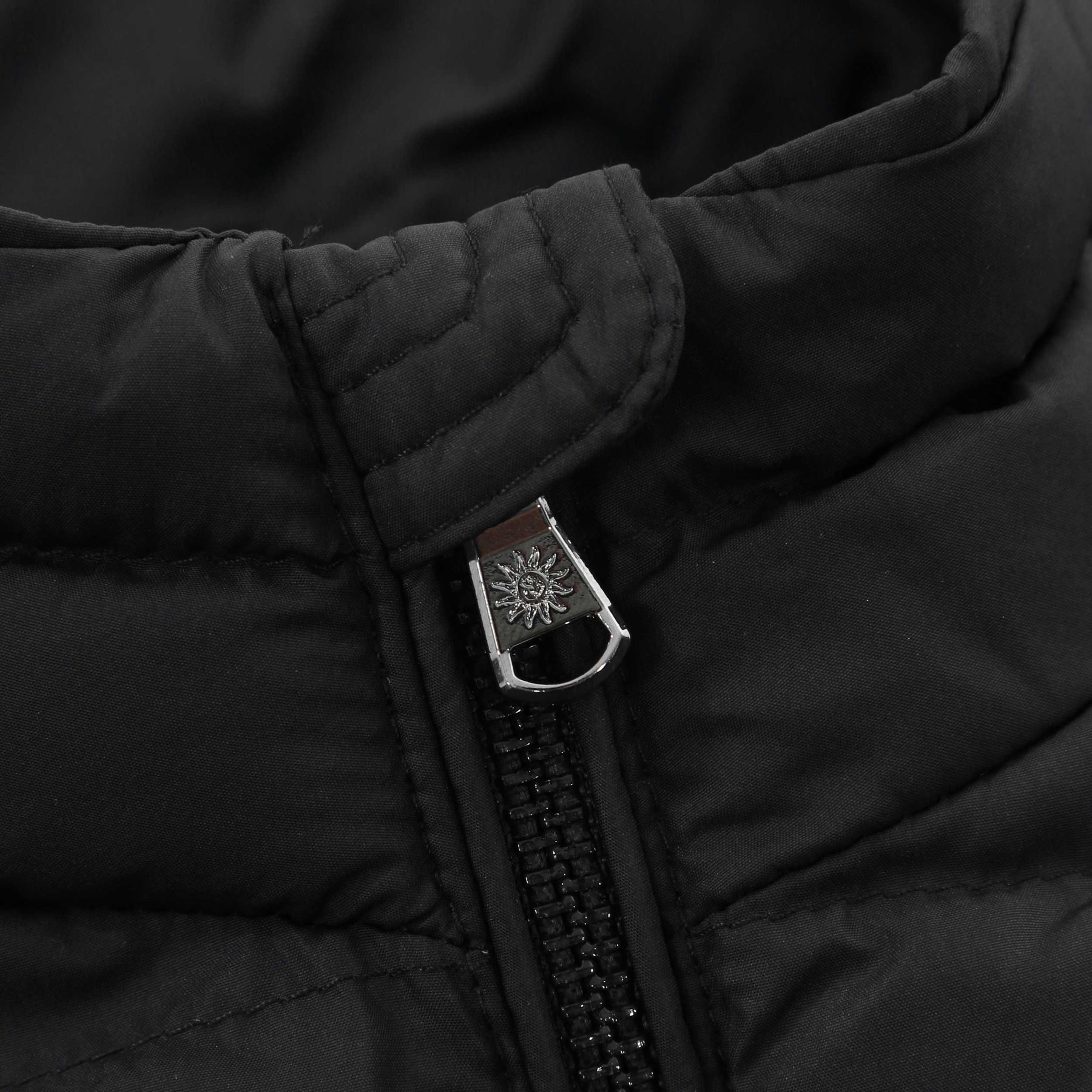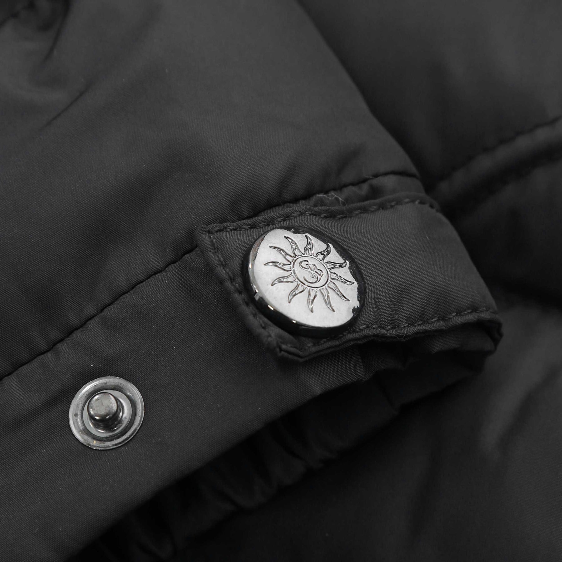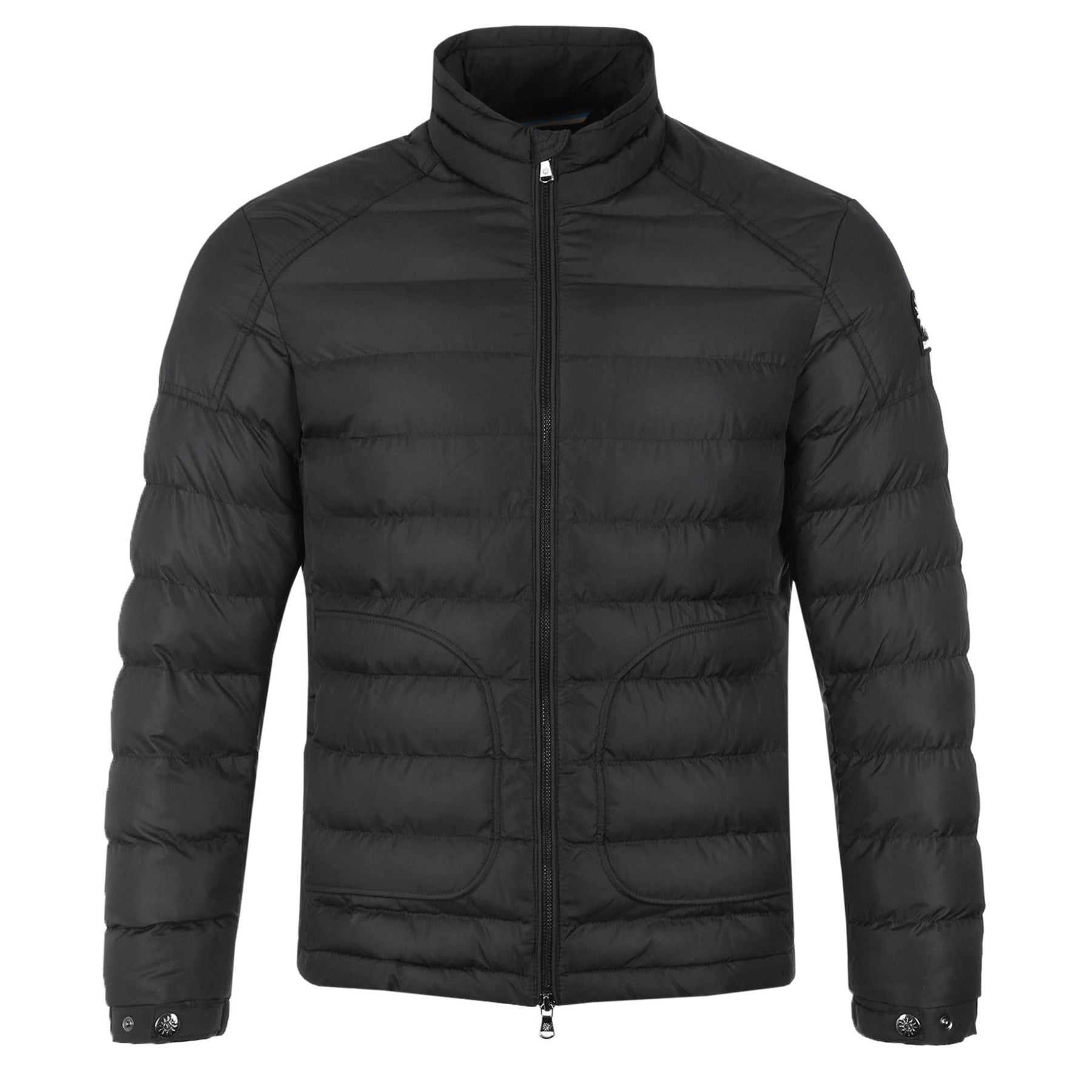 Sandbanks Biker Micro Puffer Jacket in Black. A slim fit puffer jacket by Sandbanks. Two way fastening zip placket to the front. Funnel neck jacket with racer inspired detailing's throughout the jacket. Shoulder panel detailing. Zip fastening front pocket with external stitch detail. Elasticated, adjustable press stud cuffs. Embroidered Sandbanks logo badge to the sleeve.