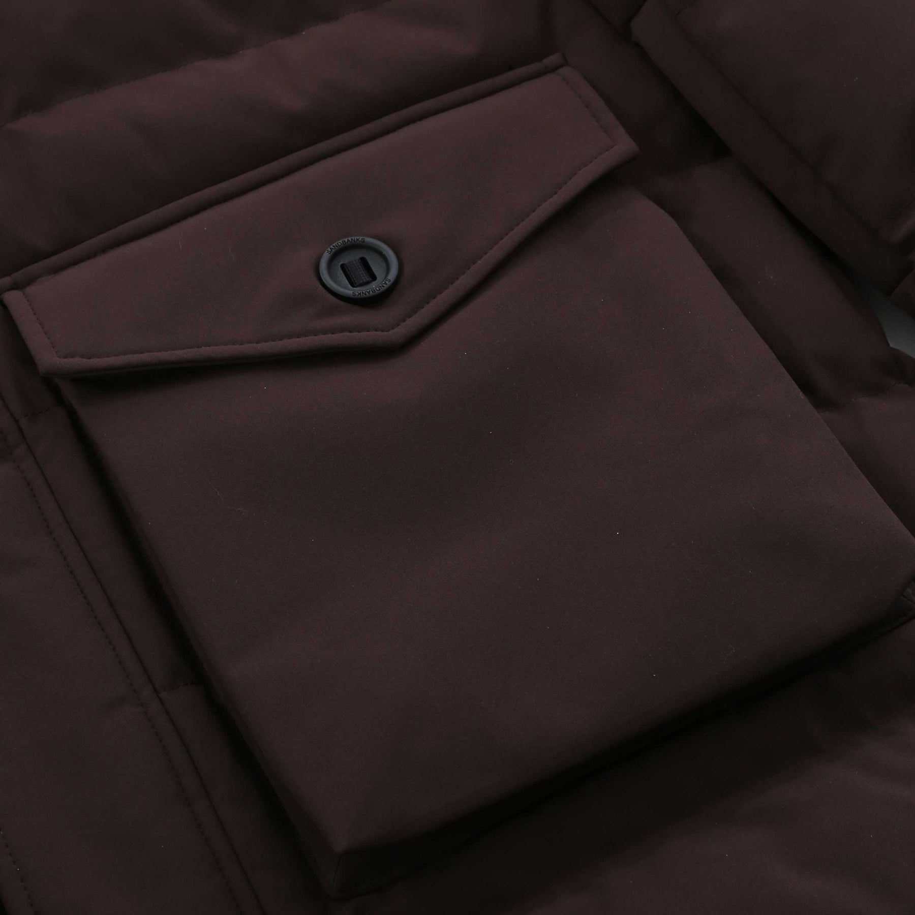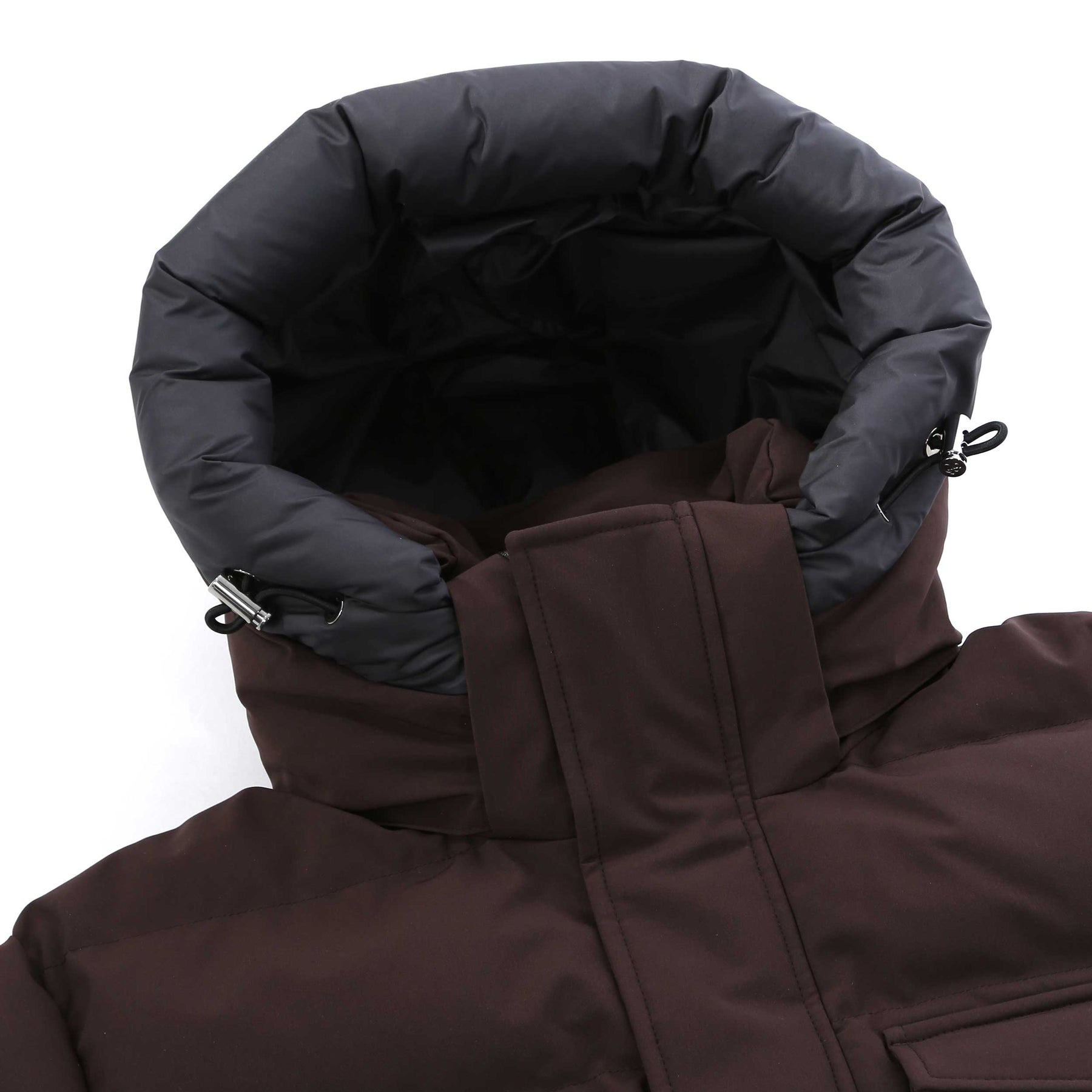 Sandbanks Branksome Long Puffer Jacket in Chocolate. A long length puffer jacket by Sandbanks. Two way fastening zip placket to the front with snap fastening storm flap. Detachable hood with elasticated drawstrings. Four flap fastening pockets to the front of the jacket. Concealed ribbed cuffs. Embroidered Sandbanks logo badge to the sleeve.