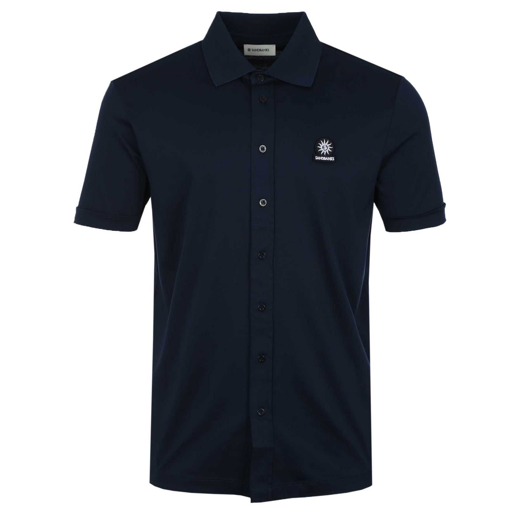 Sandbanks Interlock Full Button Polo Shirt in Navy. Polo shirt by Sandbanks. A slim fitting polo shirt with short sleeves. Classic style ribbed polo collar with a full button fastening placket. Turn up cuffs. Constructed from a mercerised interlock cotton for a luxurious feel. Sandbanks embroidered logo badge to the chest.
