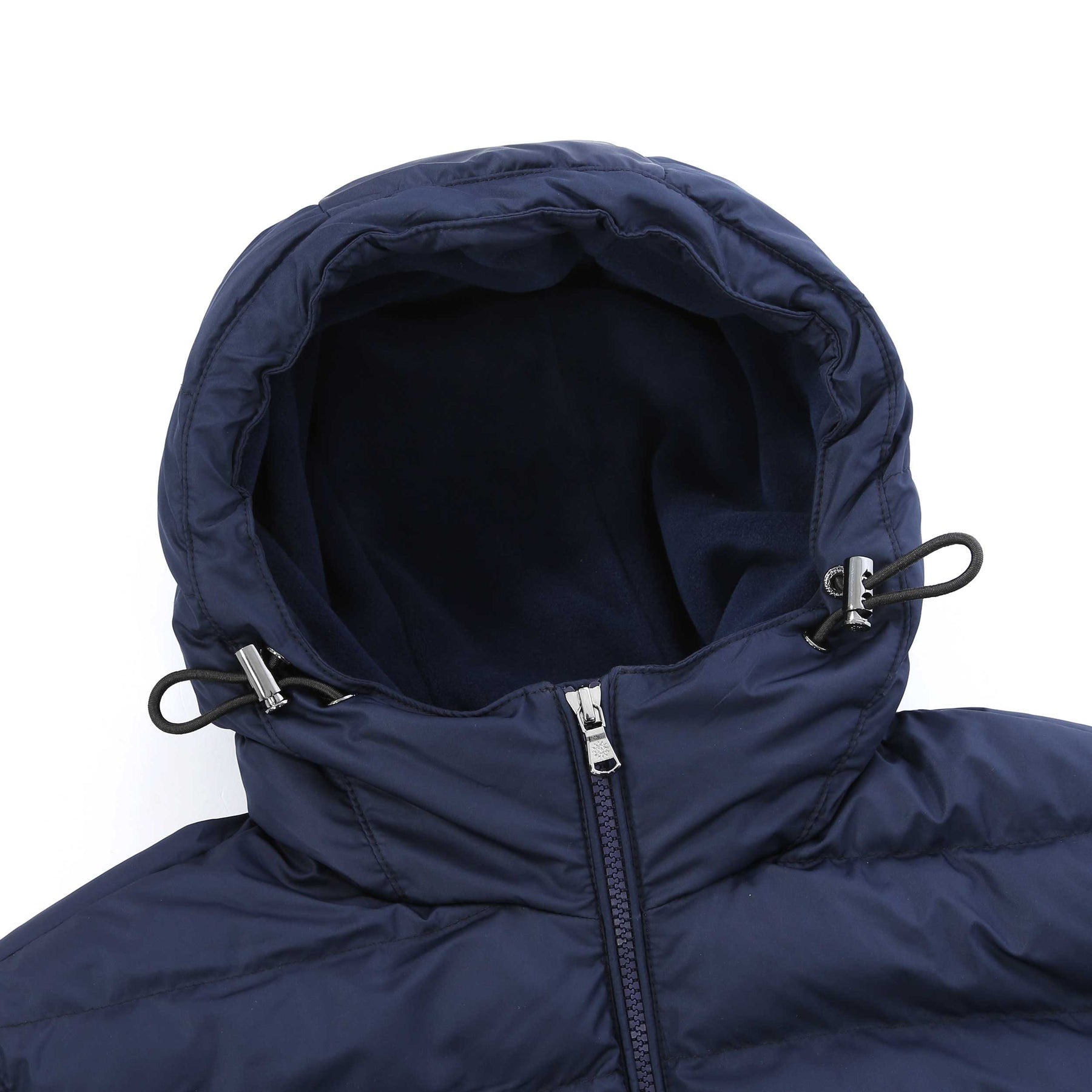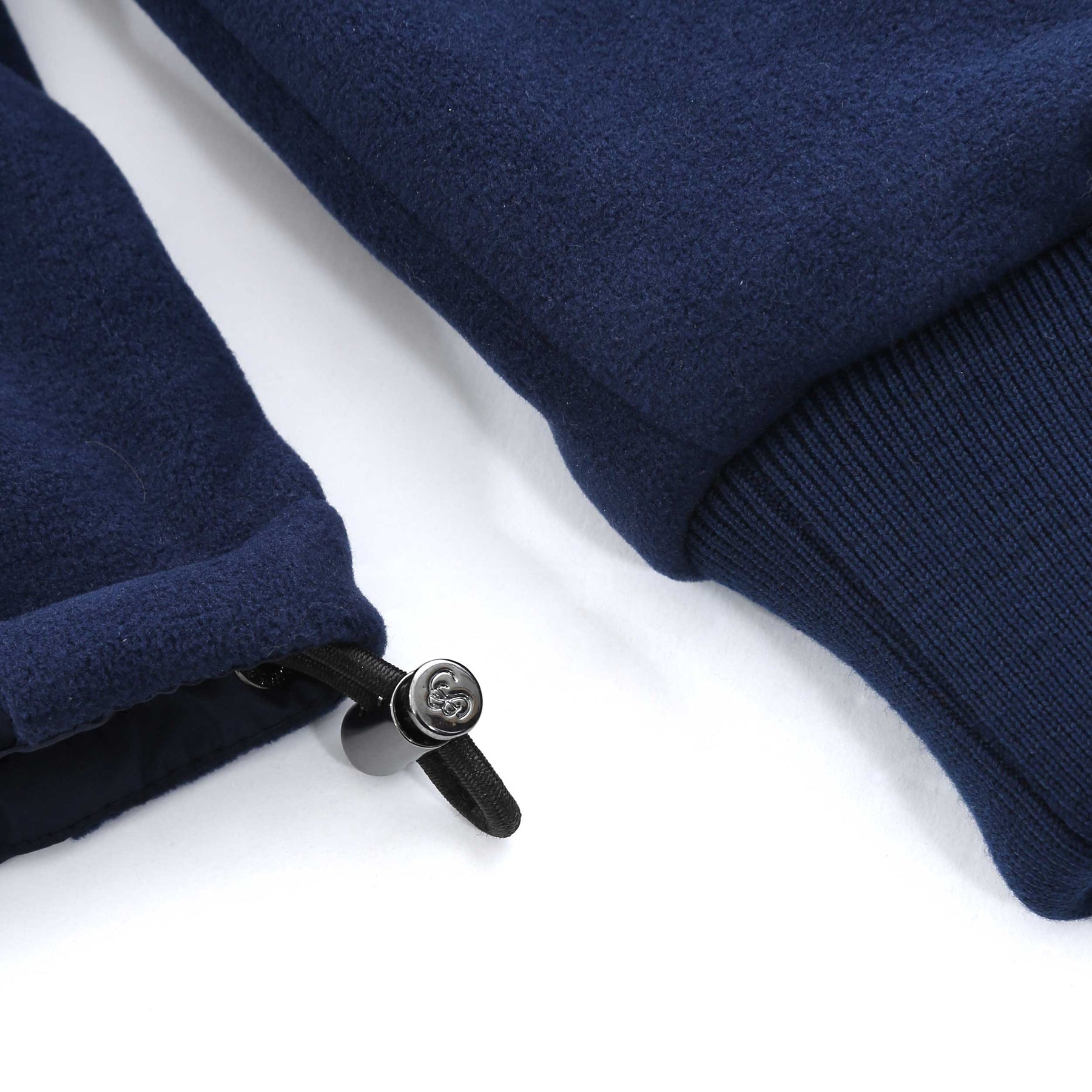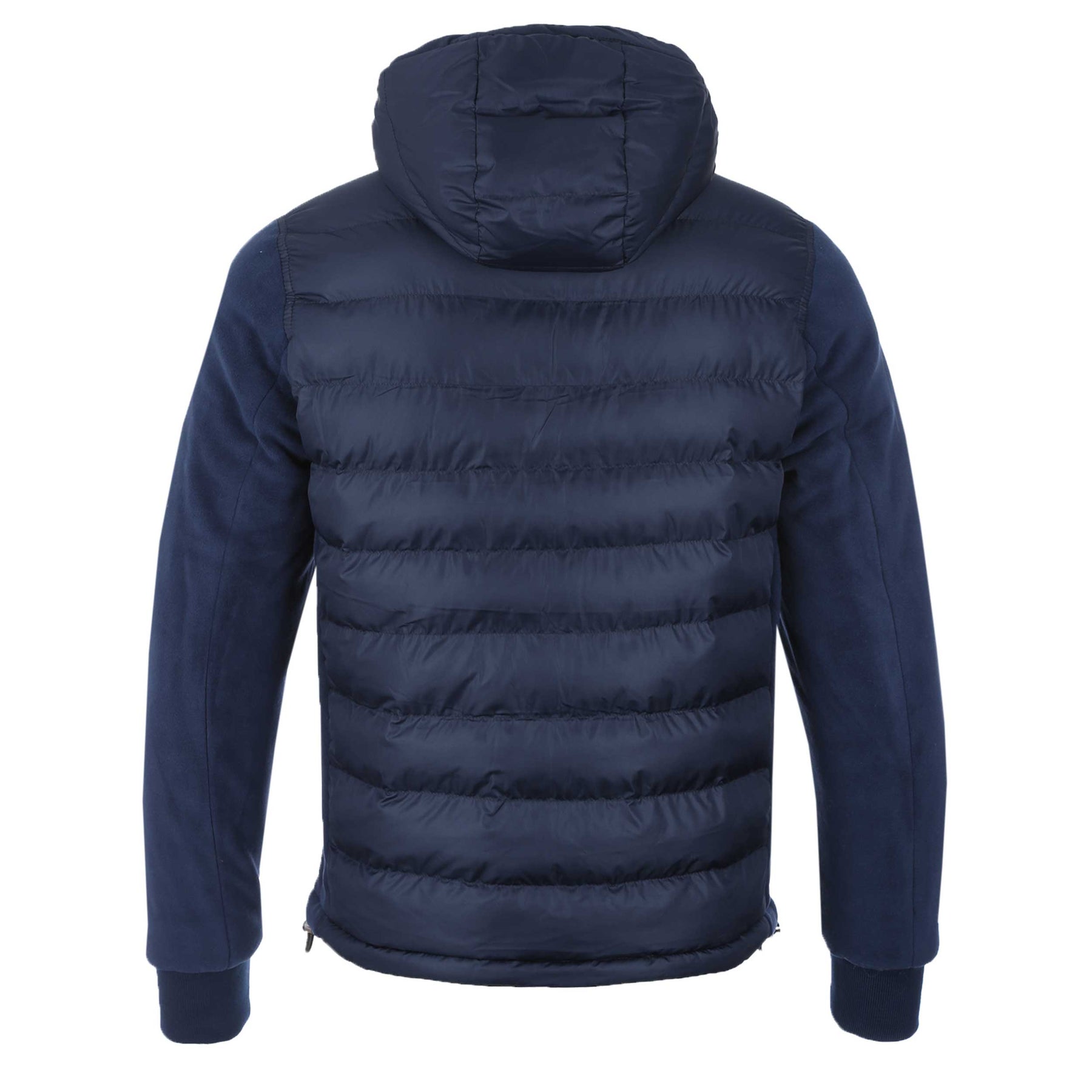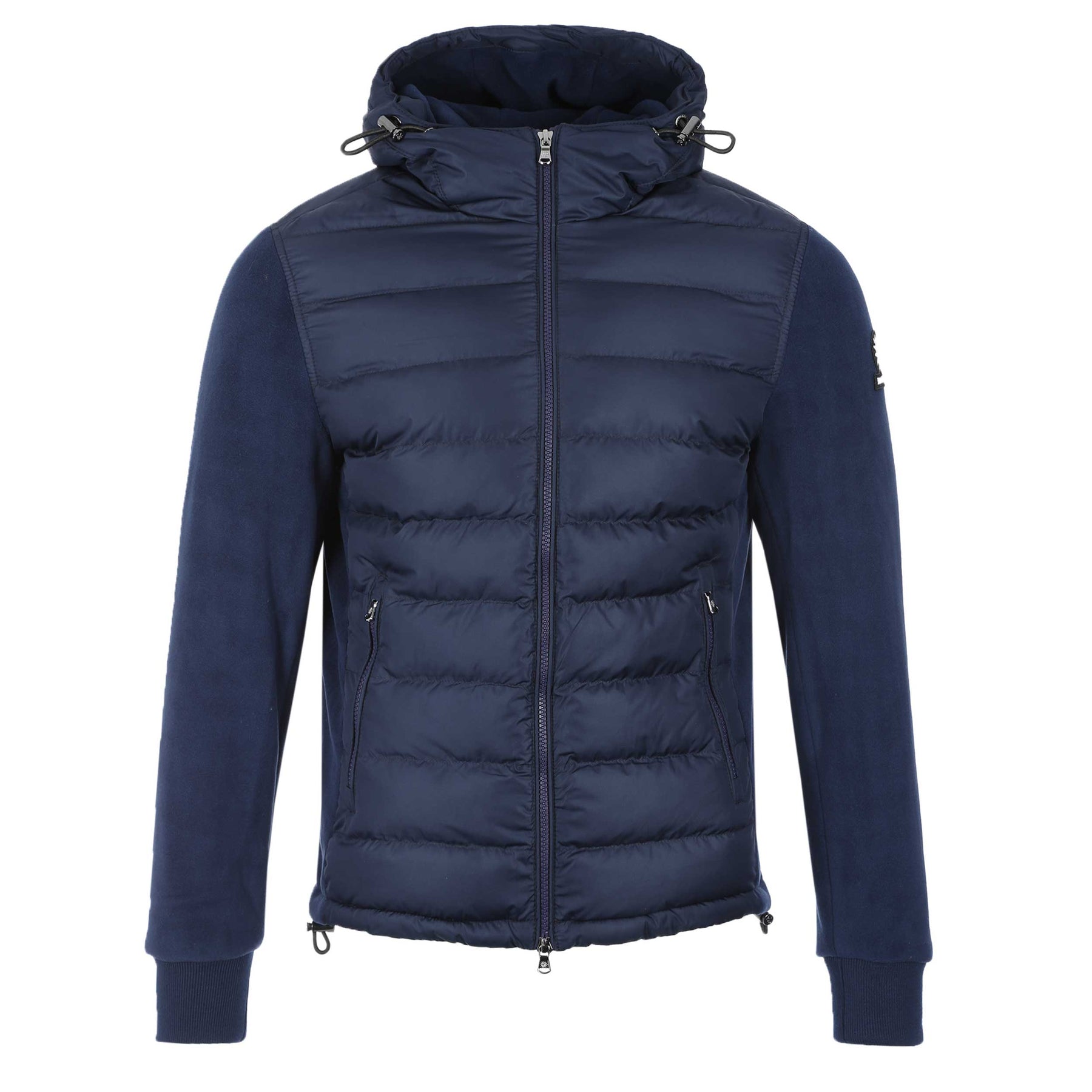 Sandbanks Polartec Hybrid Jacket in Navy. A regular fit puffer jacket by Sandbanks. Two way fastening zip placket to the front. Fleece lined hood with elasticated drawstrings. Contrasting quilted body. Fleece sleeves with elasticated ribbed cuffs. Adjustable waist with elasticated pulls. Two way zipper front pockets. Embroidered Sandbanks logo badge to the sleeve.