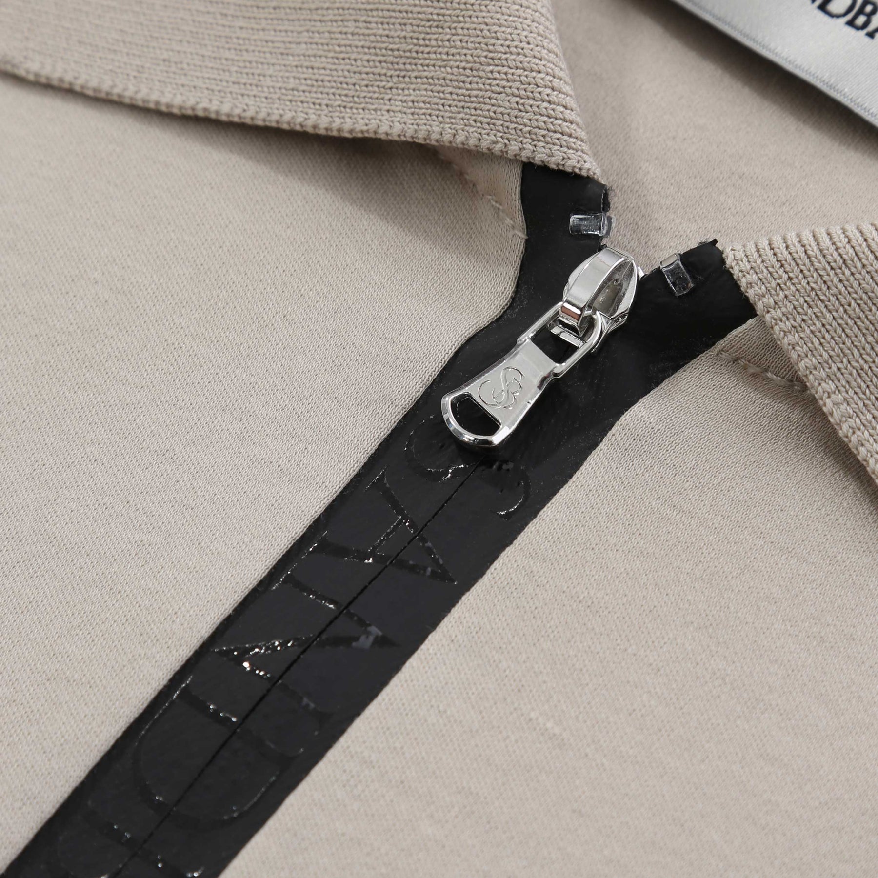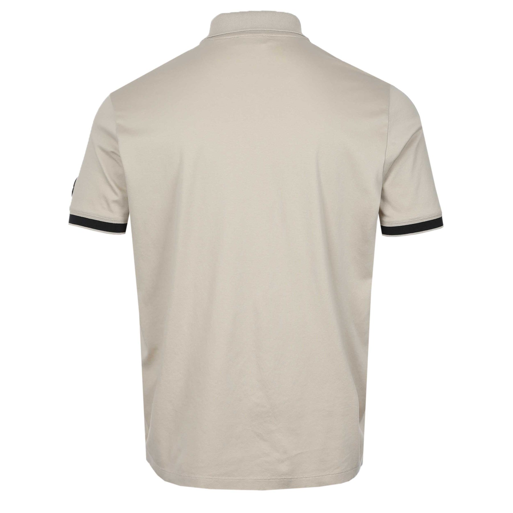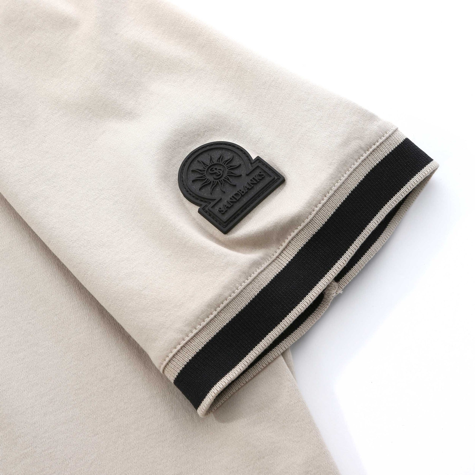 Sandbanks Silicone Zip Polo Shirt in Stone. Polo shirt by Sandbanks. A regular fitting polo shirt with short sleeves. Classic style polo collar with a zip fastening placket. Contrasting colour trim to the cuffs. Constructed from a mercerised cotton for a luxurious feel. Sandbanks rubberised logo to the sleeve.