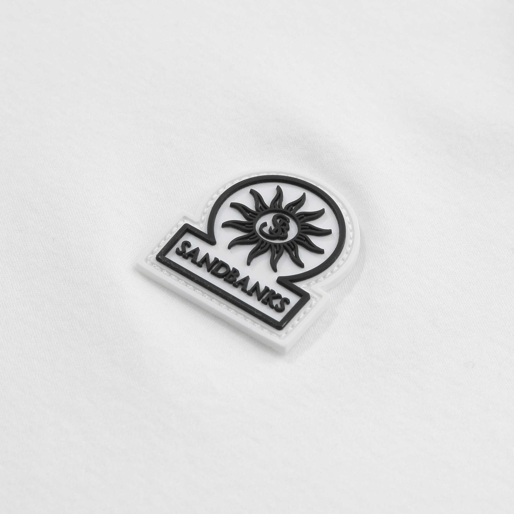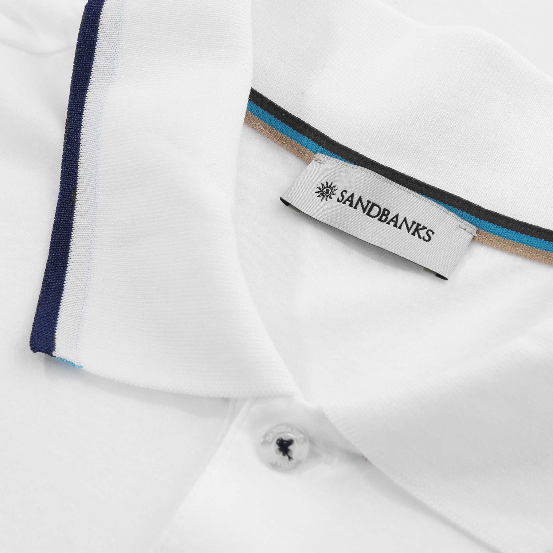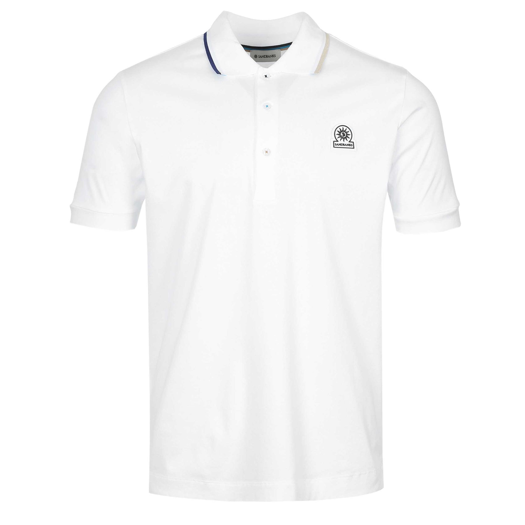 Sandbanks Tri-Colour Polo Shirt in White. Polo shirt by Sandbanks. A regular fitting polo shirt with short sleeves. Classic style polo collar with a 3 button fastening placket. Tri-colour trim to the collar. Sandbanks rubberised logo to the chest.