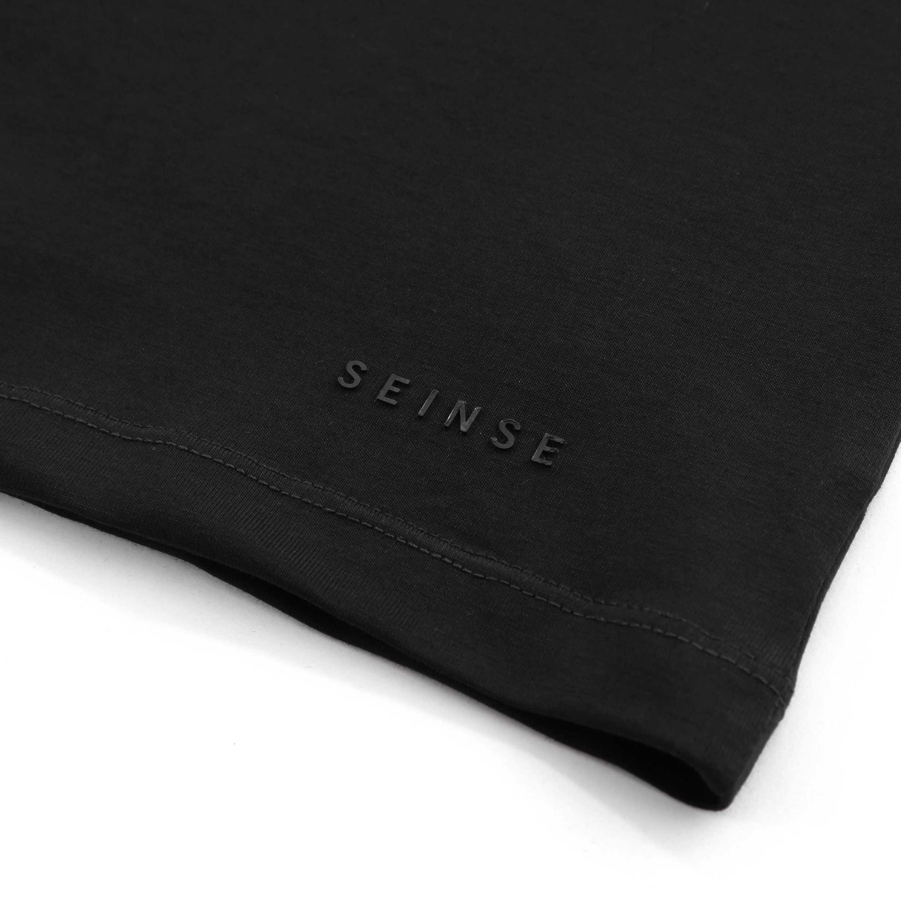 Seinse Essential Crew Neck T Shirt in Black. A plain design t-shirt with short sleeves and a crew neck by Seinse. A regular fit t shirt with stretch properties. Rubber Seinse logo badge to the waist in tonal colour. Team with a pair of jeans for the complete look.