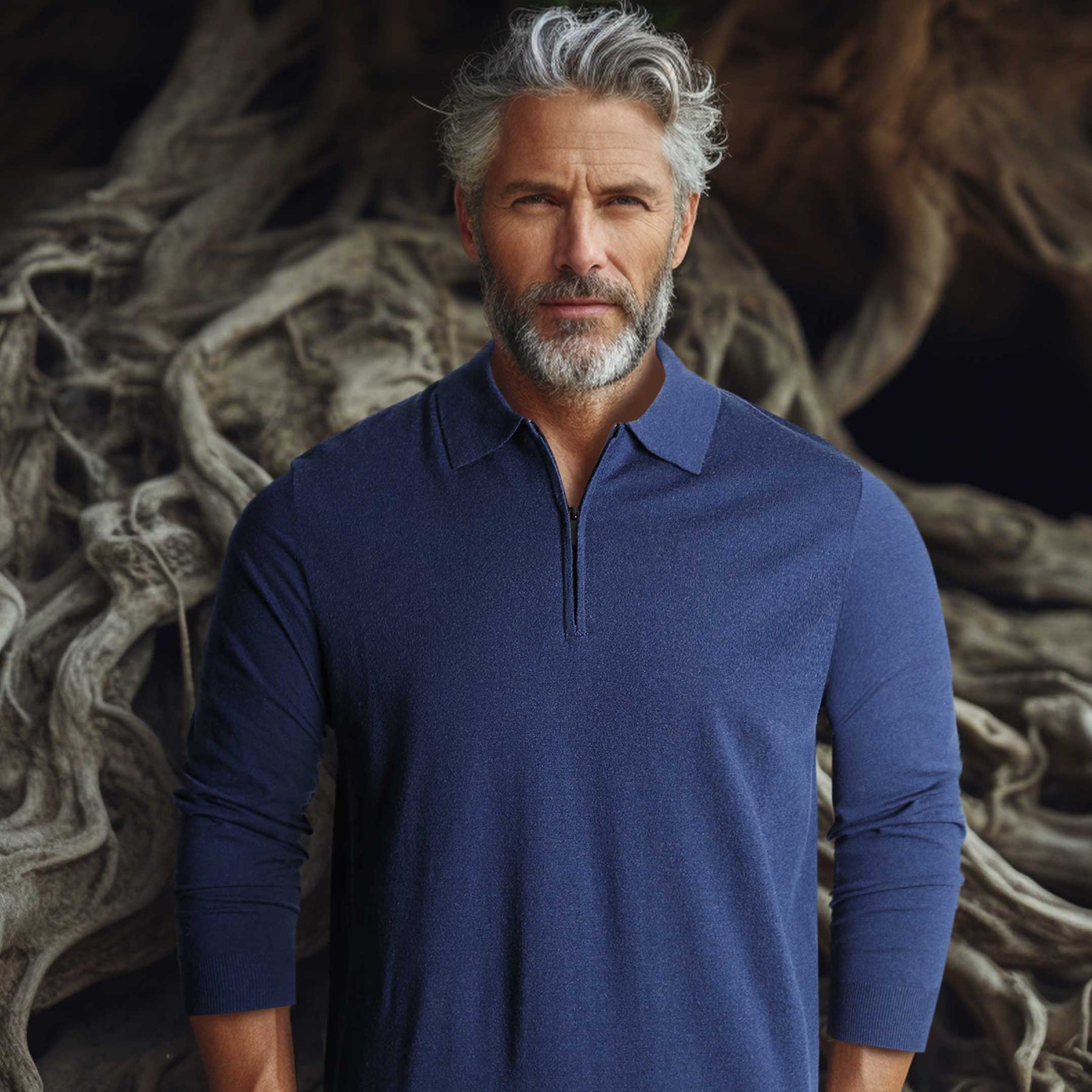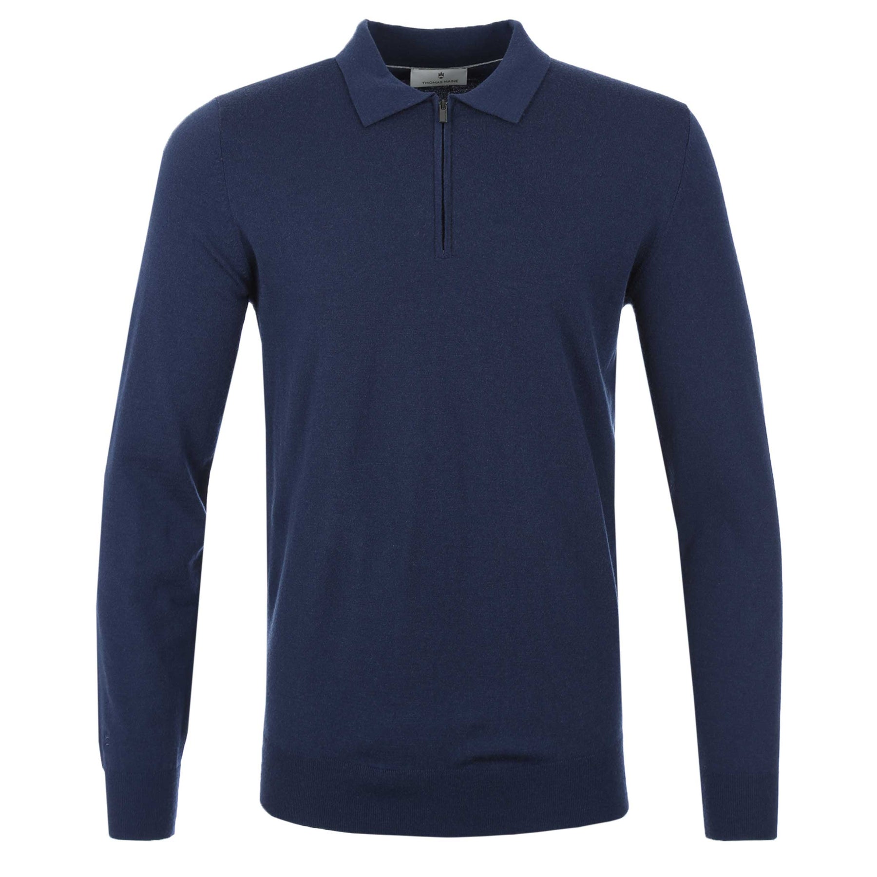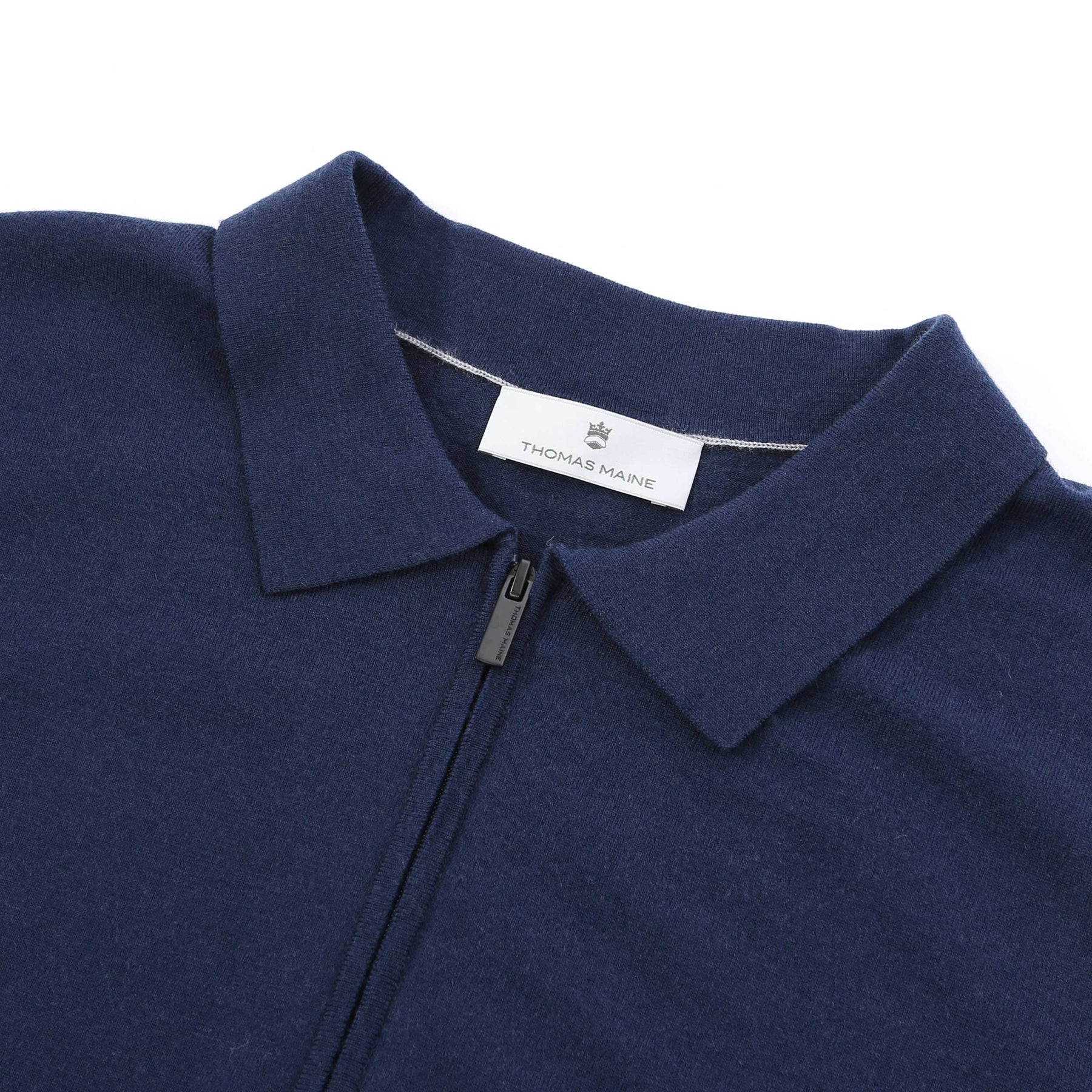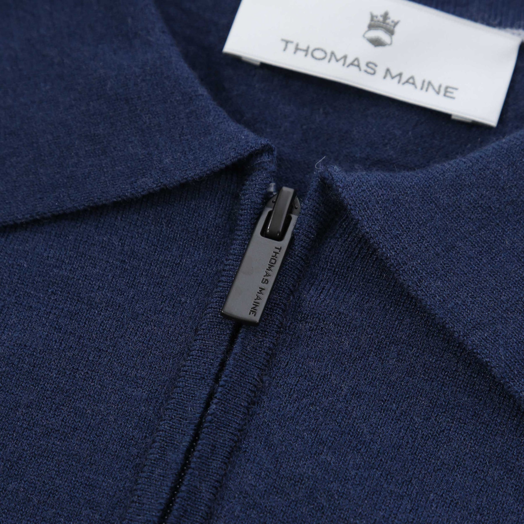 Thomas Maine Zip Knit Polo Shirt in Navy. Knitted Polo by Thomas Maine. This short sleeve Thomas Maine knitwear comes with a classic polo style collar. It features a zip fastening placket with branded zip pull. Ribbed collar, cuffs and waistband. Thomas Maine embroidered tonal logo to the cuff.