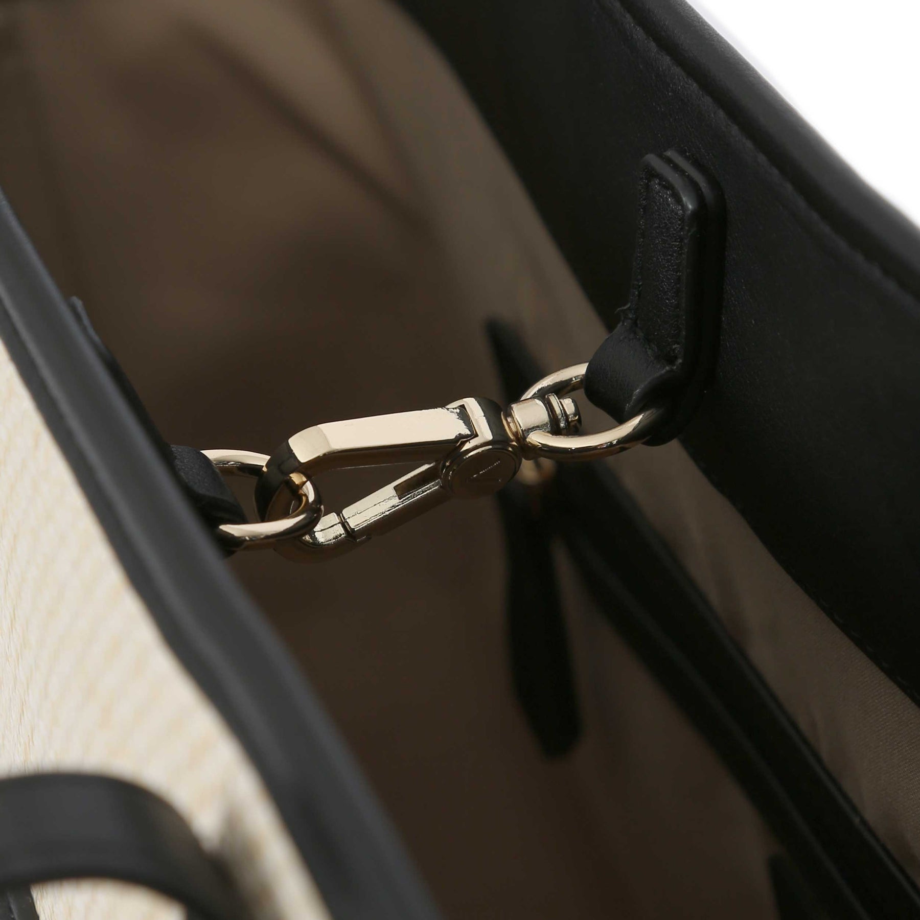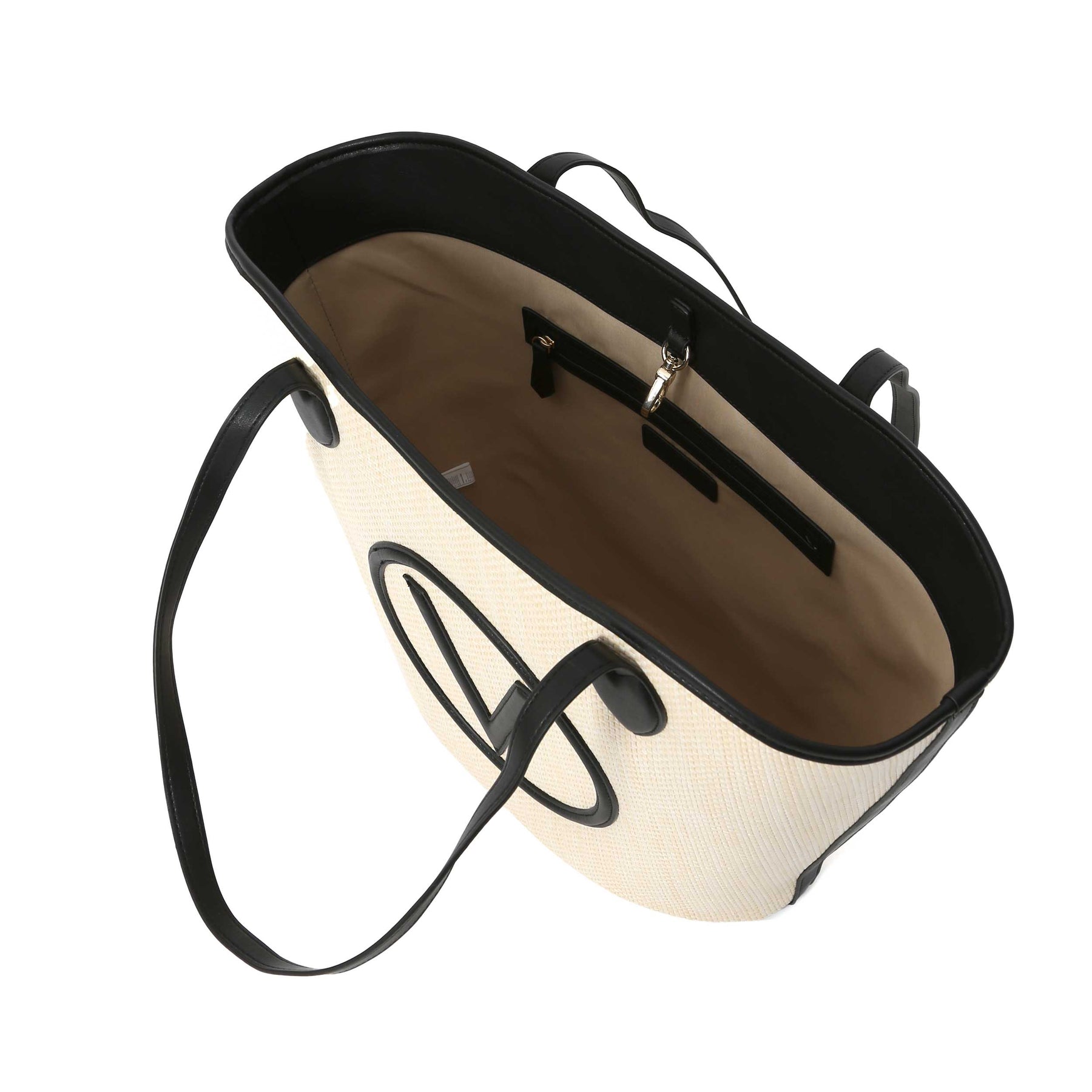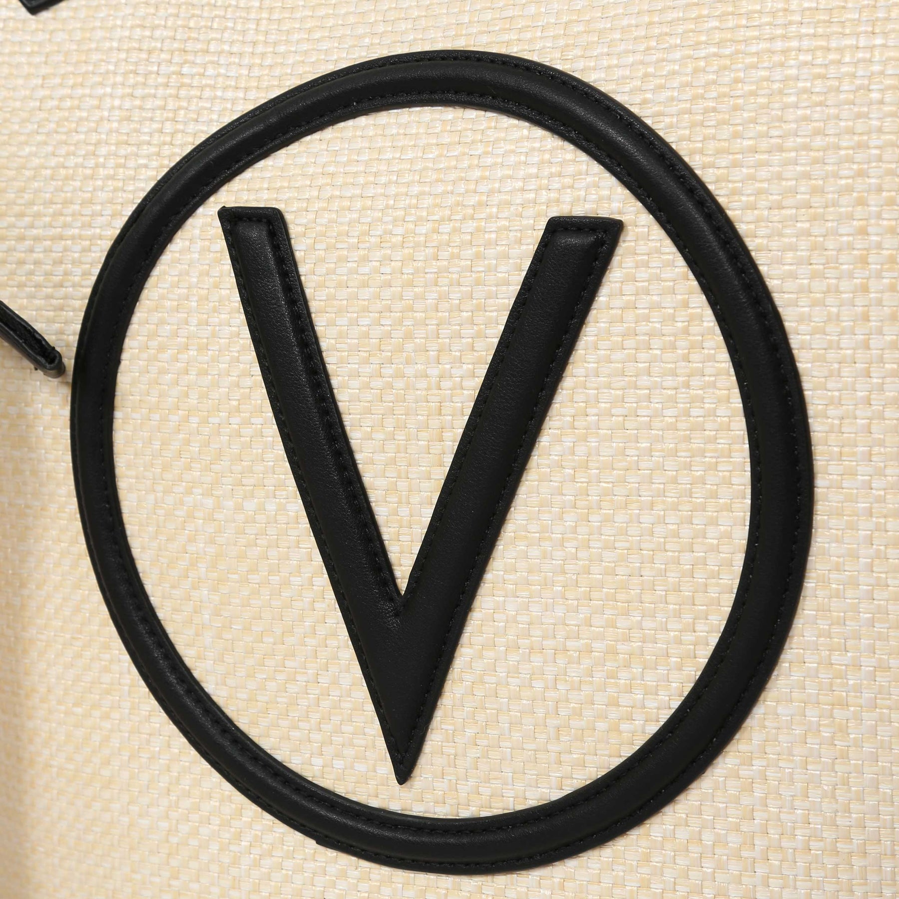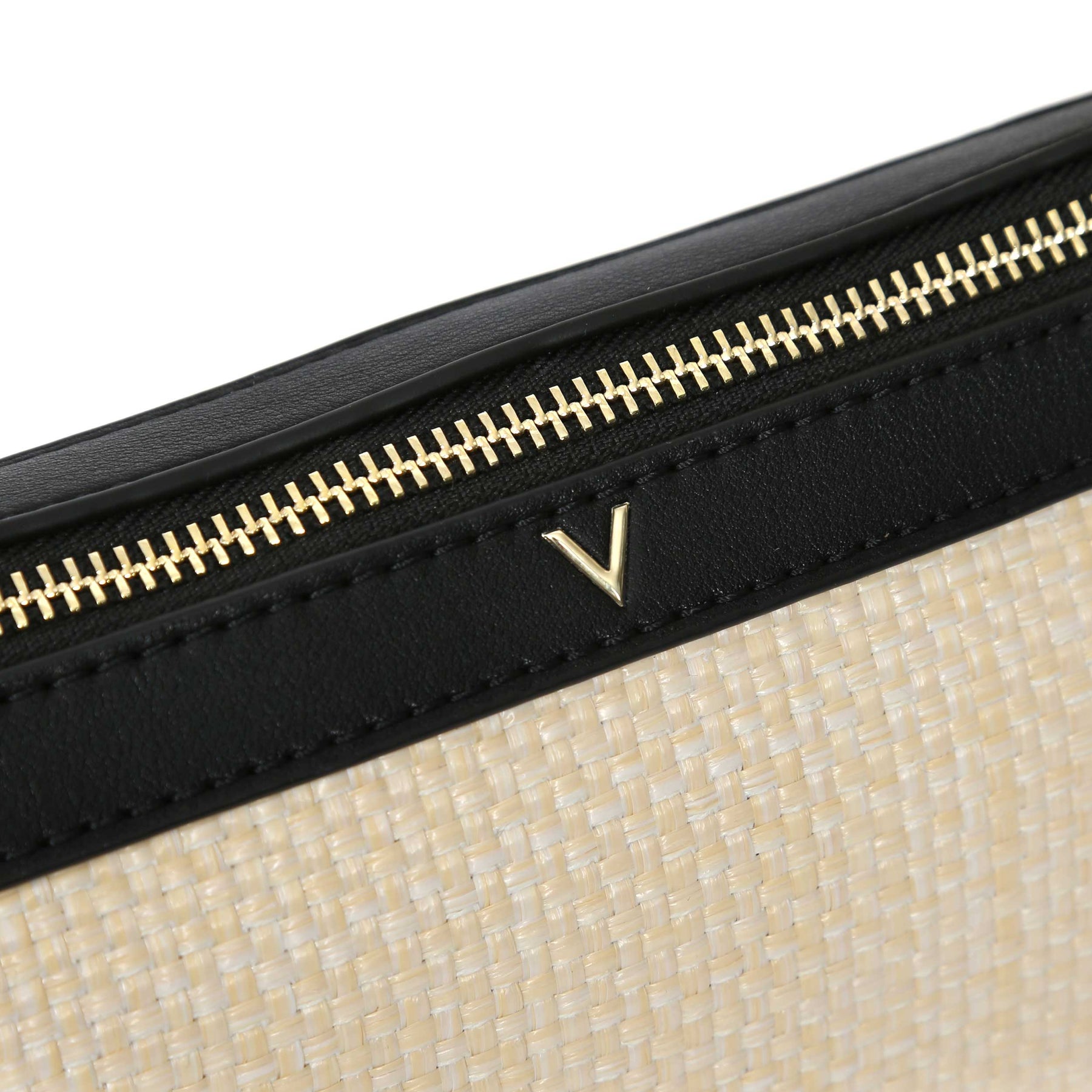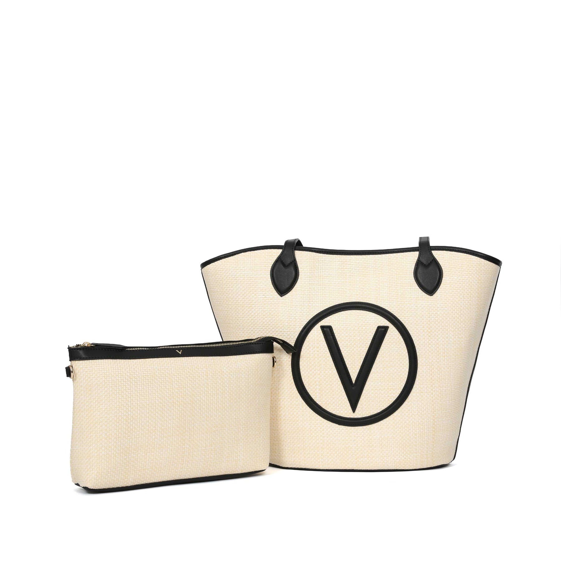 Valentino Bags Covent Ladies Beach Bag in Natural & Black. A classic beach bag style by Valentino Bags. Constructed with a rattan basket weave design. Featuring a carrier handle and a large Valentino lettering logo. Clasp fastening to the inside. Matching clutch bag included. Contrasting trim in PU leather