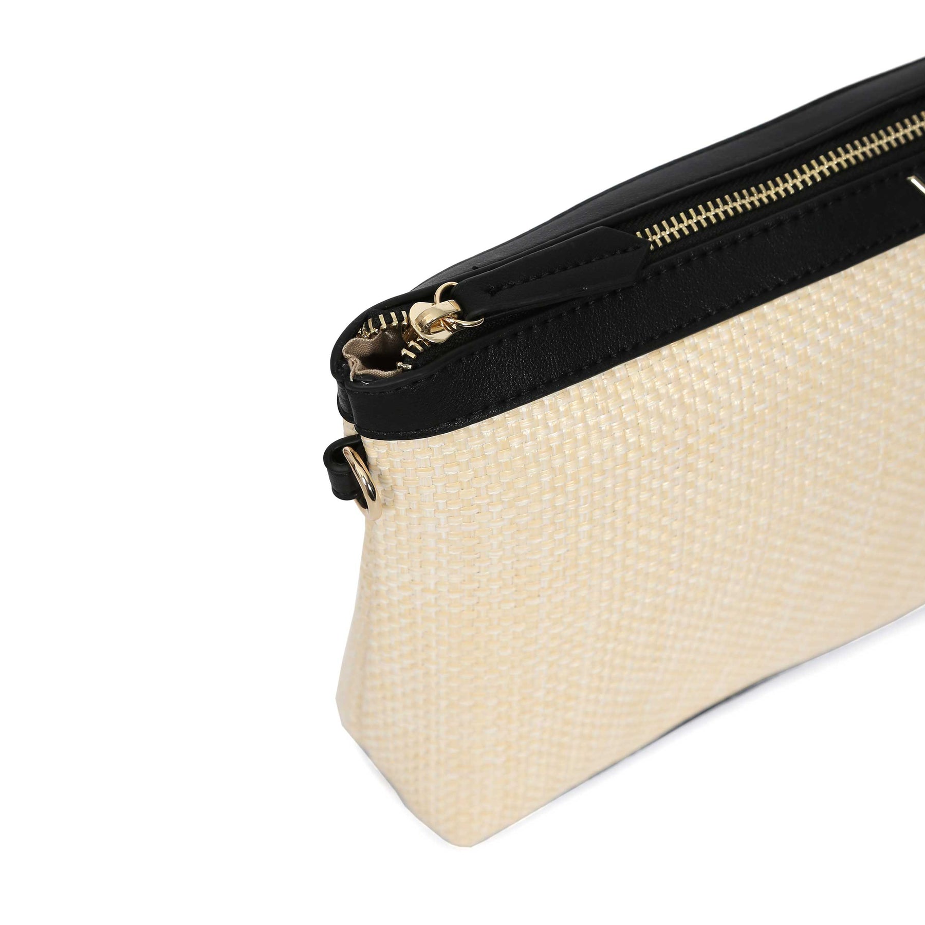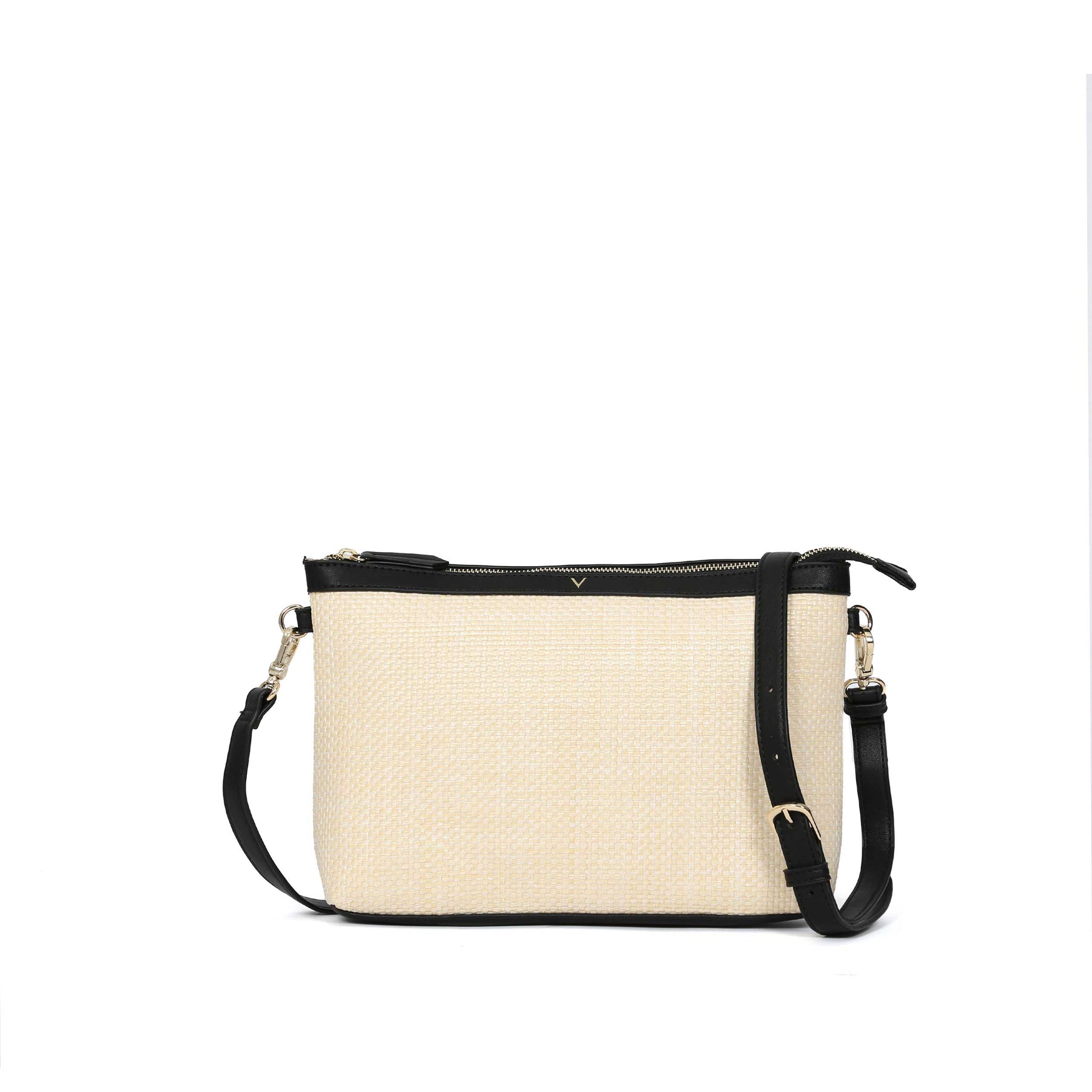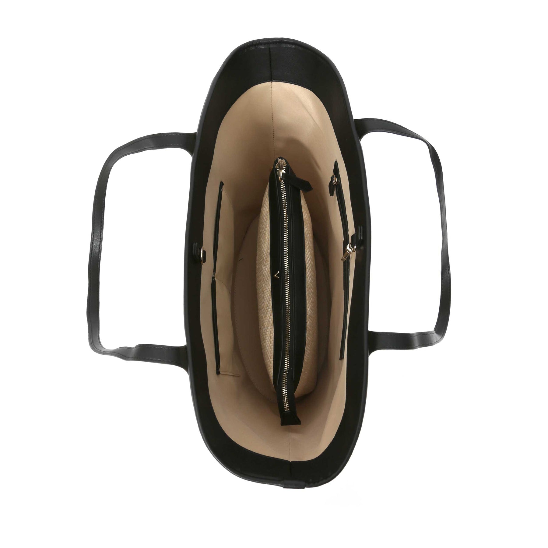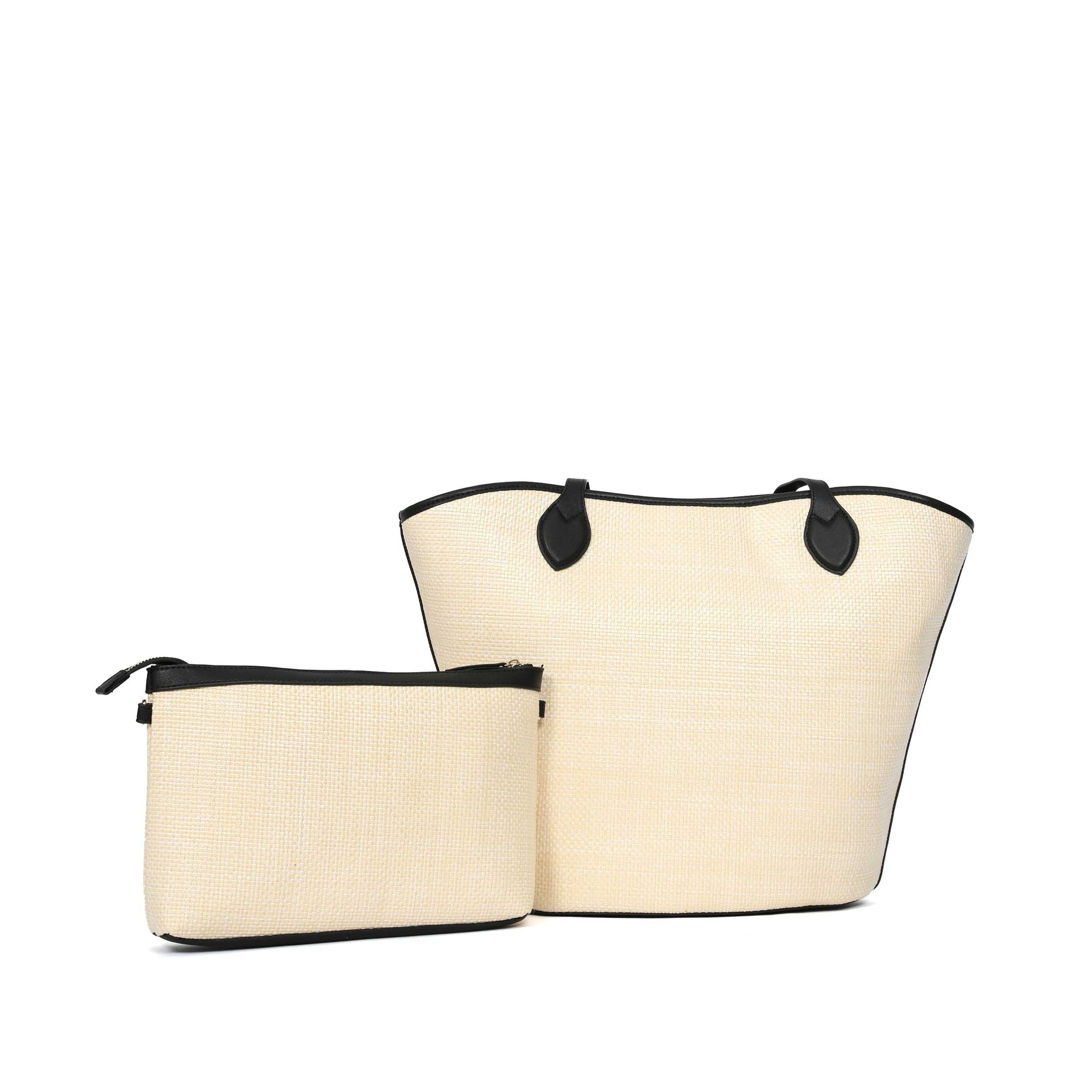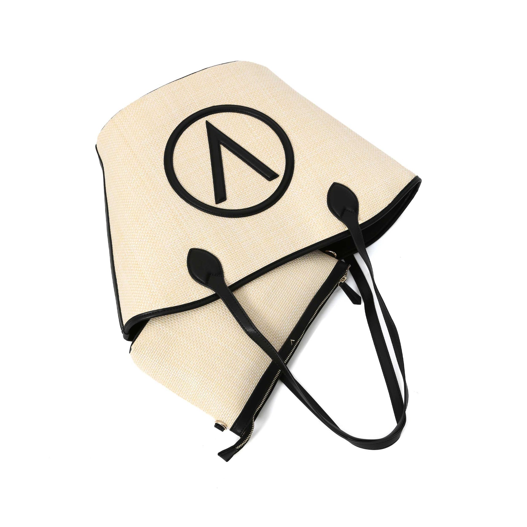 Valentino Bags Covent Ladies Beach Bag in Natural & Black. A classic beach bag style by Valentino Bags. Constructed with a rattan basket weave design. Featuring a carrier handle and a large Valentino lettering logo. Clasp fastening to the inside. Matching clutch bag included. Contrasting trim in PU leather