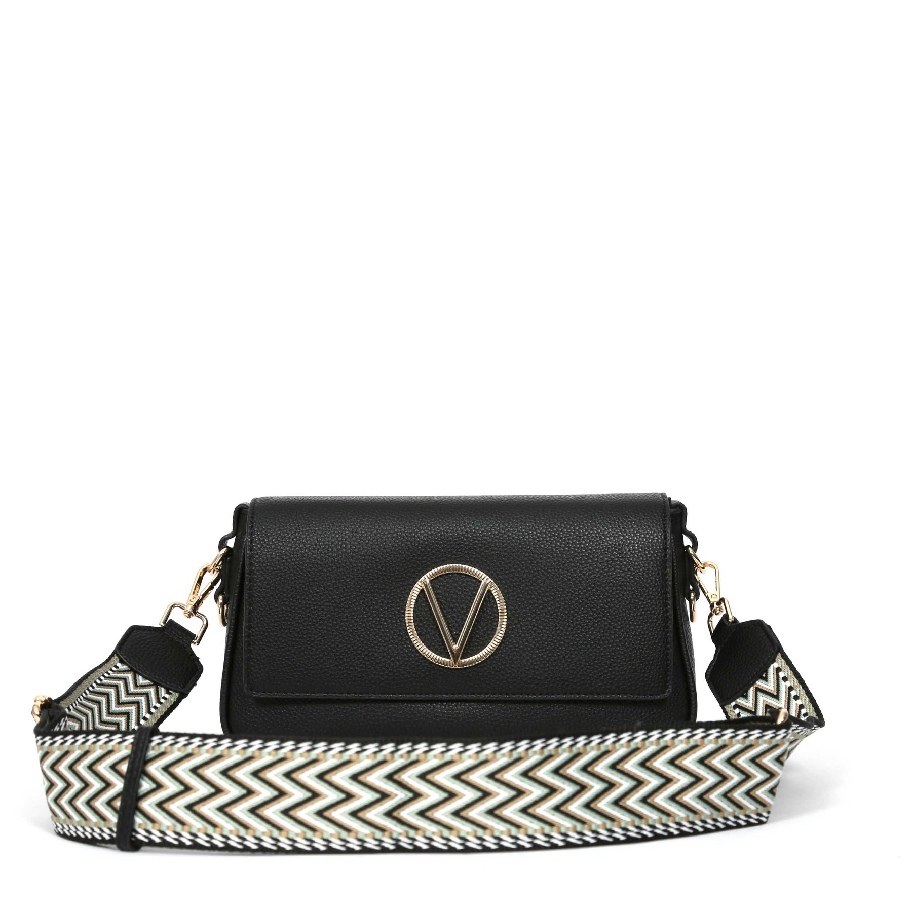 Valentino Bags Katong Ladies Shoulder Bag in Black. A classic style hand bag by Valentino Bags. Fold over front with magnetic fastening. Detachable leather shoulder strap as well as a detachable contrasting chevron design strap and leather carry handle. Zip fastening with branded Valentino zip. Finished with a Valentino logo and gold hardware.