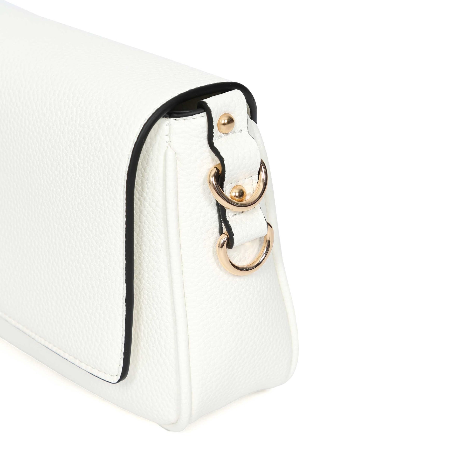 Valentino Bags Katong Ladies Shoulder Bag in White. A classic style hand bag by Valentino Bags. Fold over front with magnetic fastening. Detachable leather shoulder strap as well as a detachable contrasting chevron design strap and leather carry handle. Zip fastening with branded Valentino zip. Finished with a Valentino logo and gold hardware.